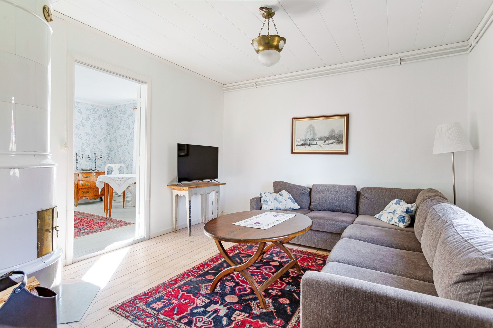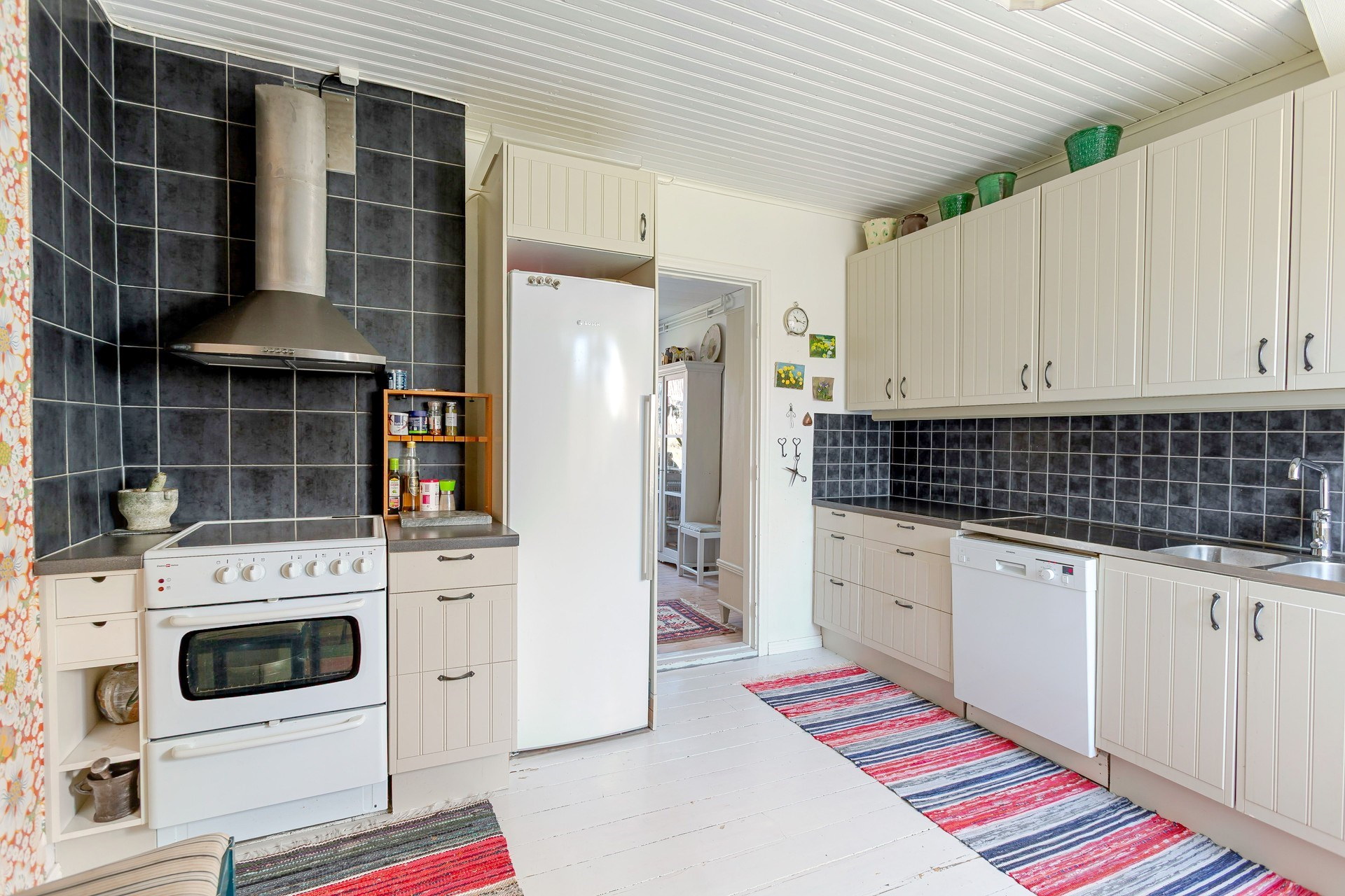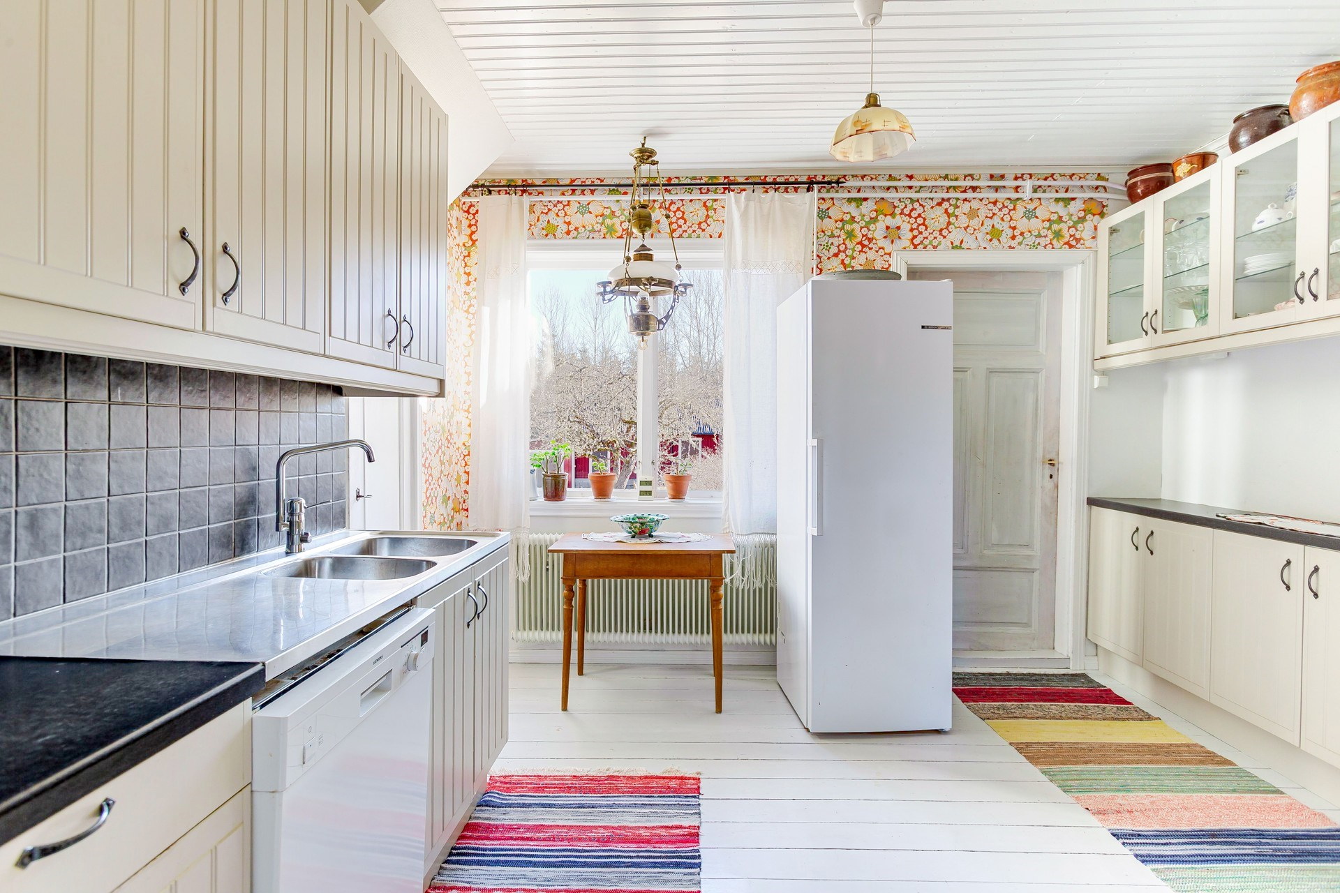 Flur / Esszimmer mit Kachelofen / Wohnzimmer mit Kachelofen / Küche mit E-Herd, Kühlschrank, Gefrierschrank, Geschirrspüler und Speisekammer / Schlafzimmer mit Kachelofen / Badezimmer mit WC und Dusche