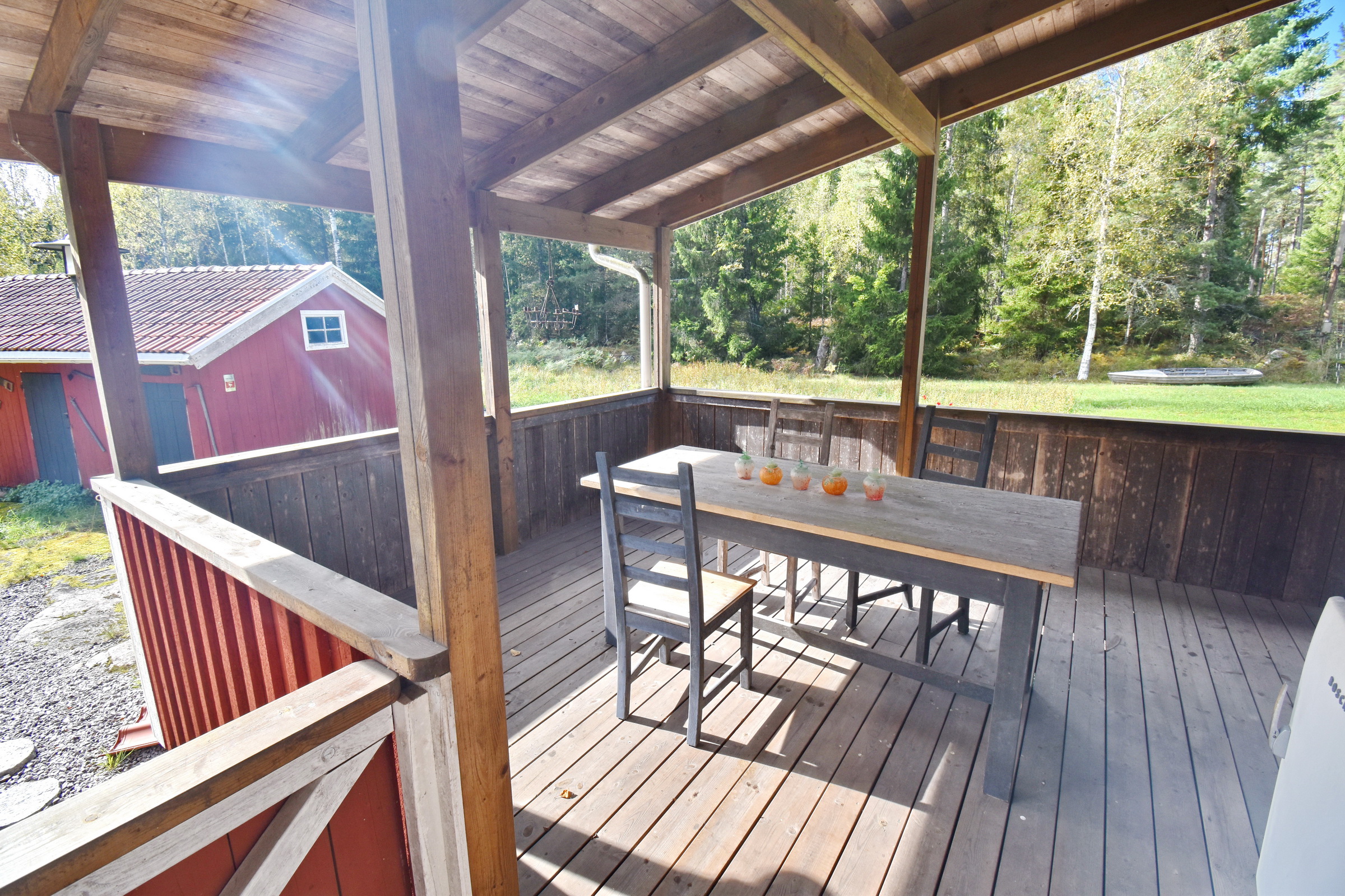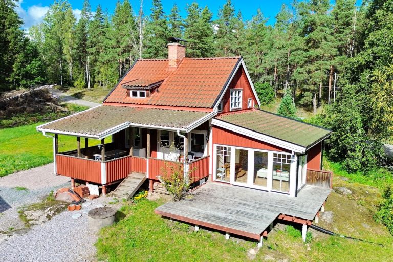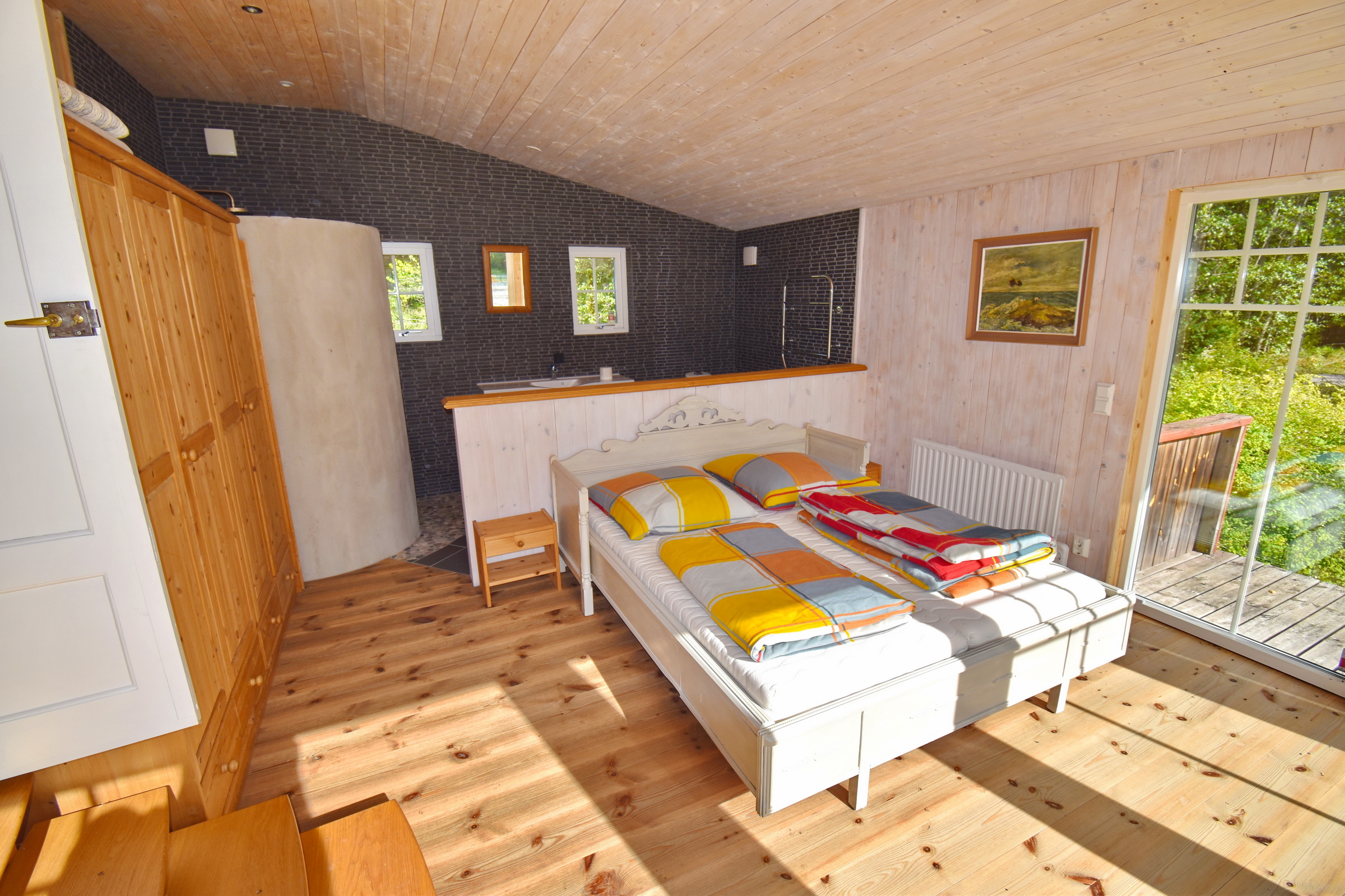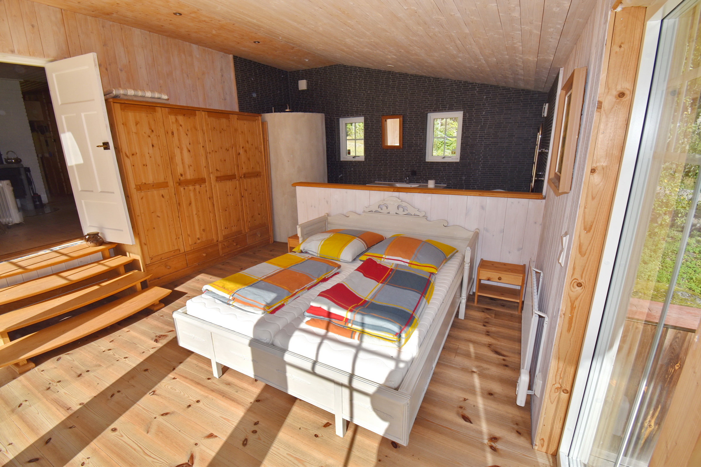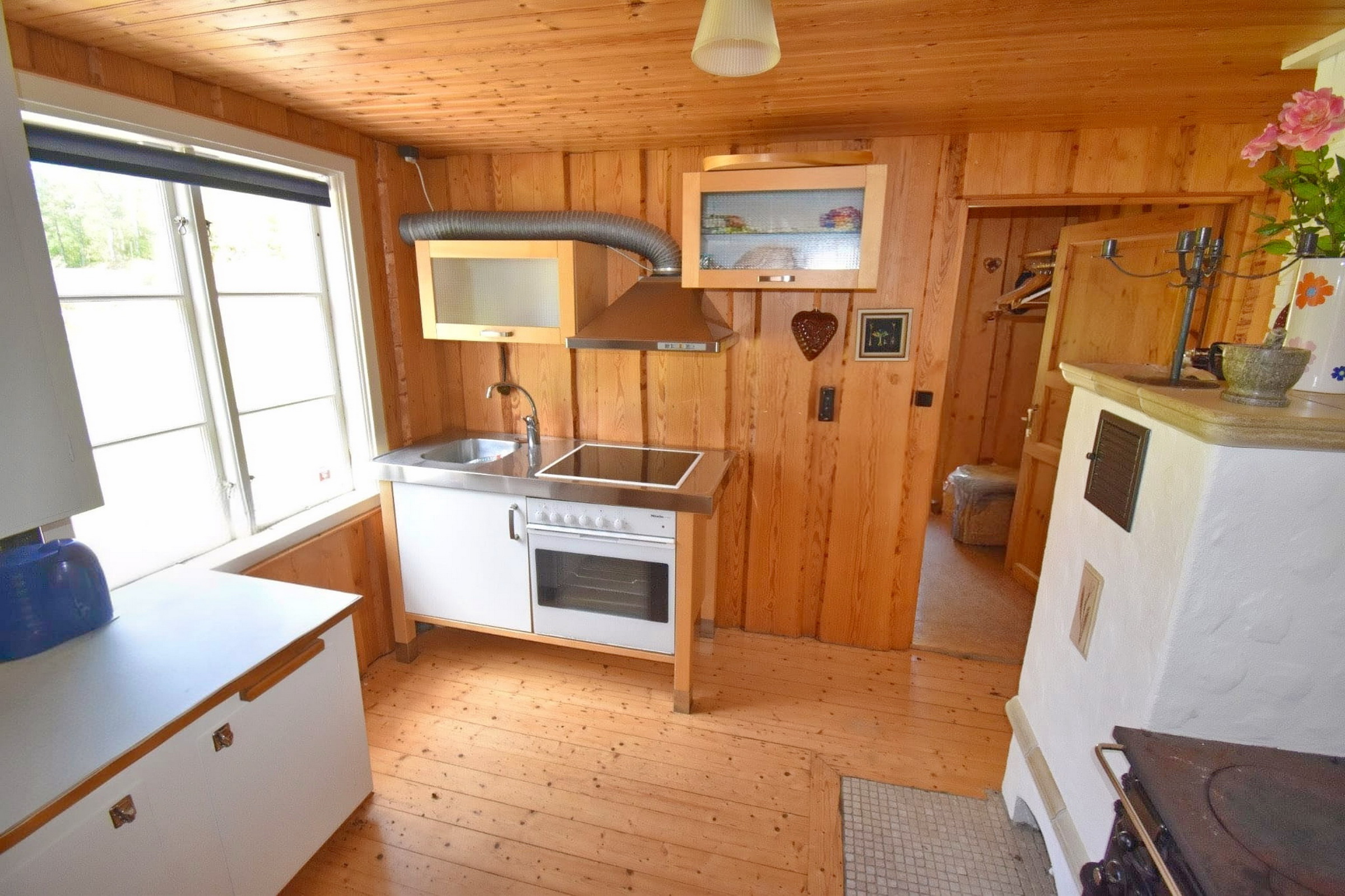 Eingangsveranda / Flur / Abstellraum mit Waschmaschine / Küche mit E-Herd, Holzherd, Kühl-Gefrierschrank und Geschirrspüler sowie Kachelofen / Wohnzimmer mit Kaminofen und Ausgang zur überdachten Terrasse / Schlafzimmer mit integriertem Bad mit WC und Dusche mit Fußbodenheizung im Fliesenbereich, Ausgang zur Terrasse