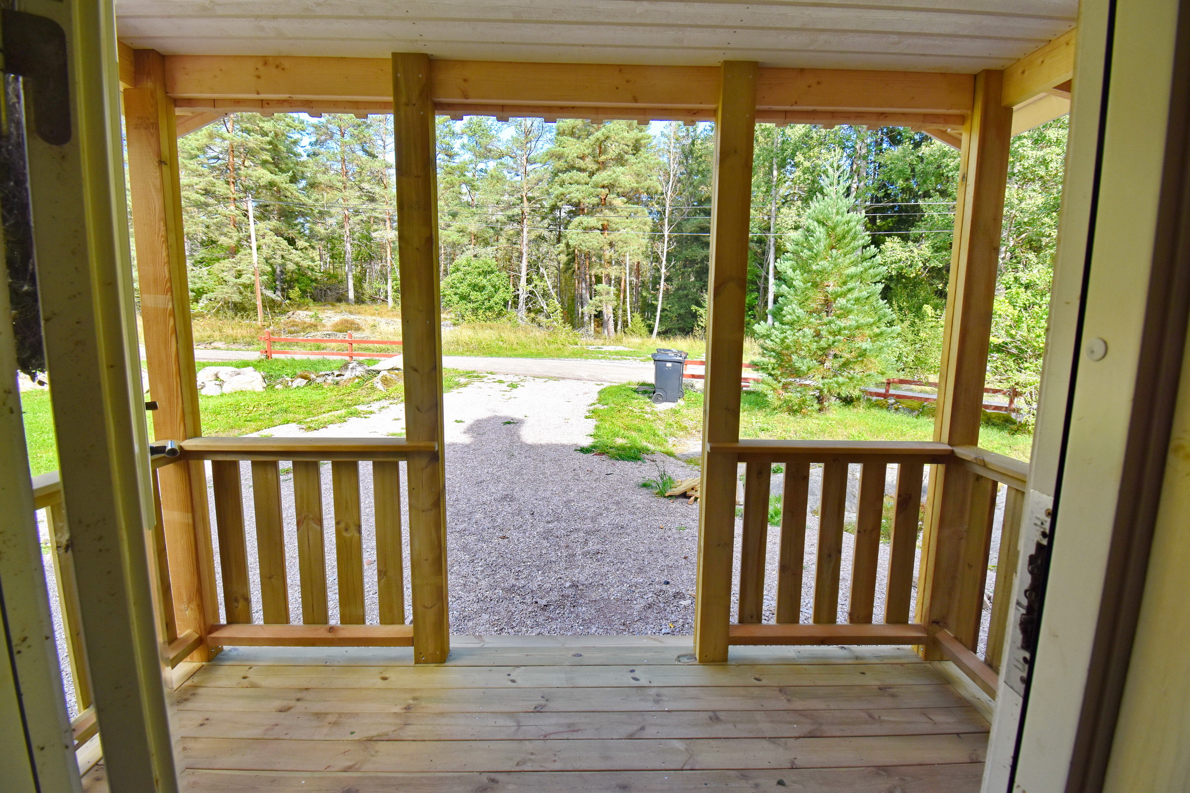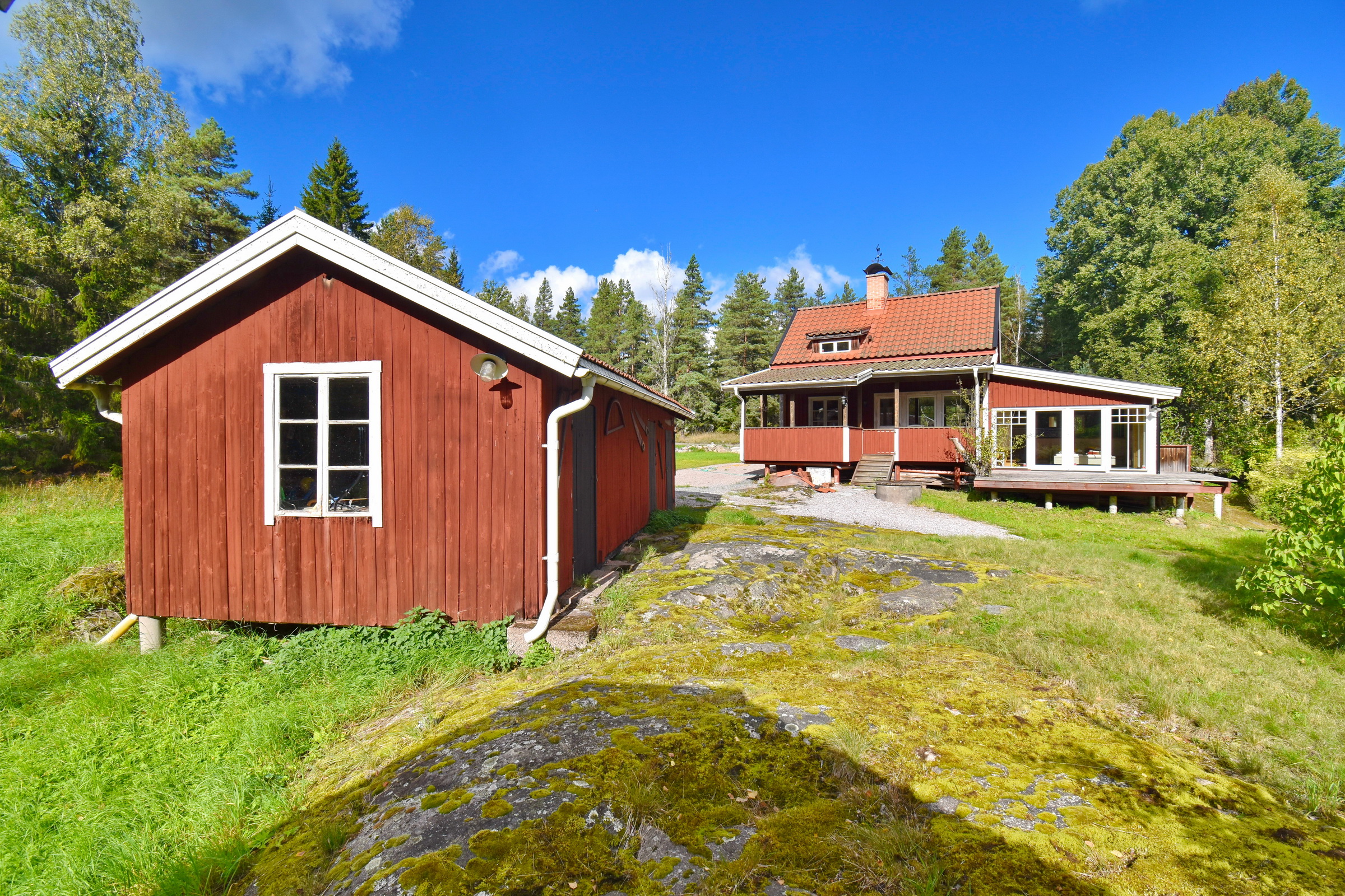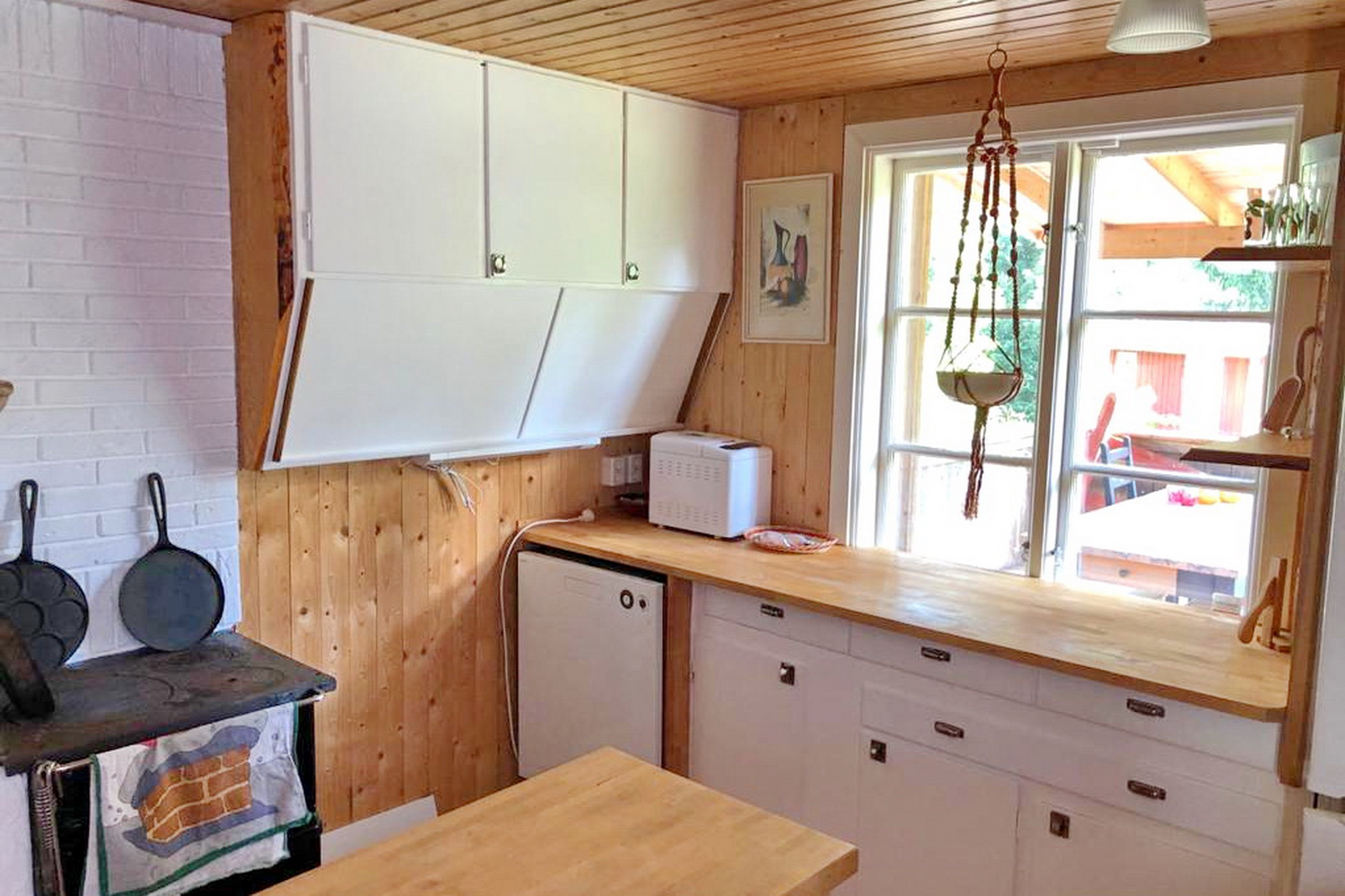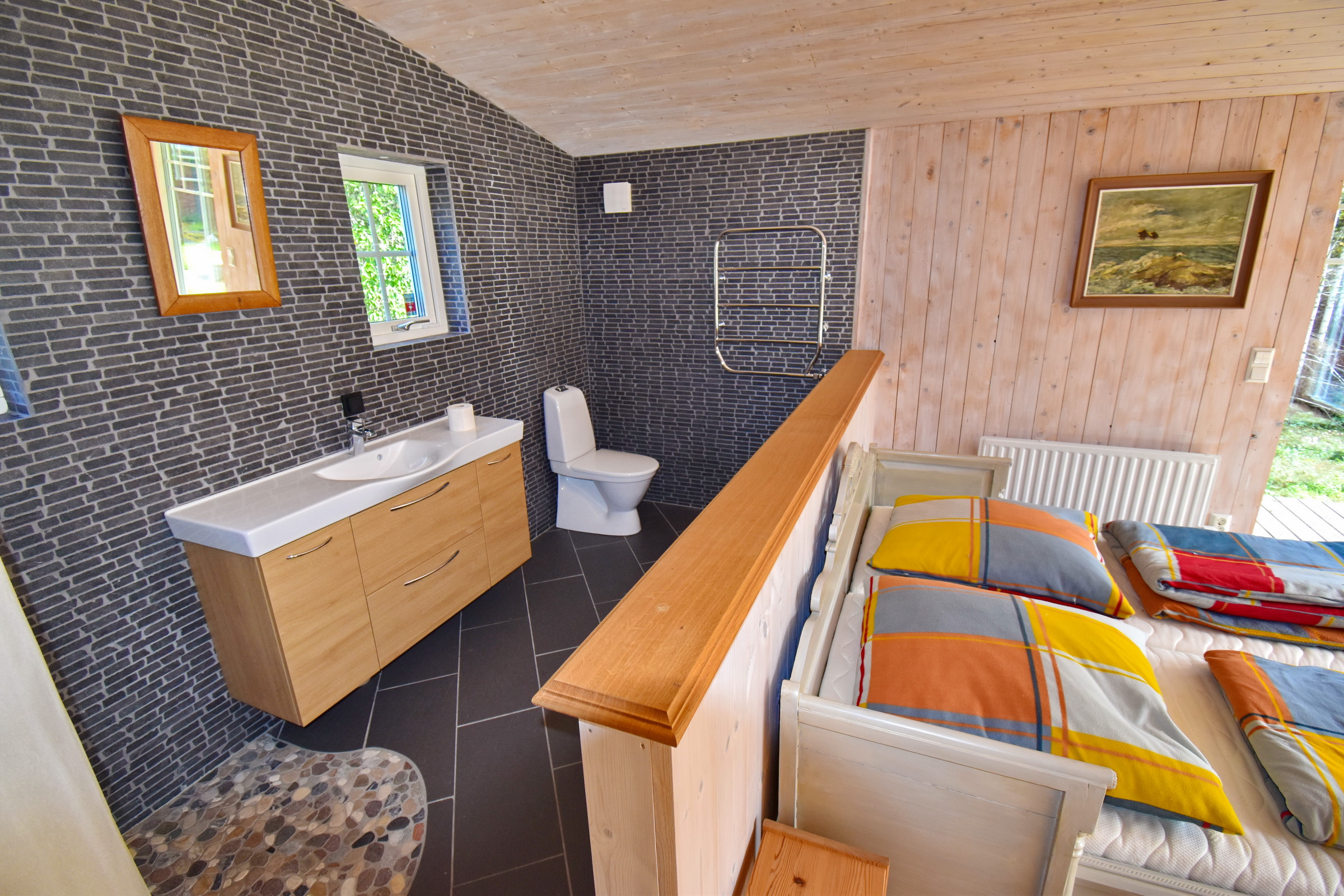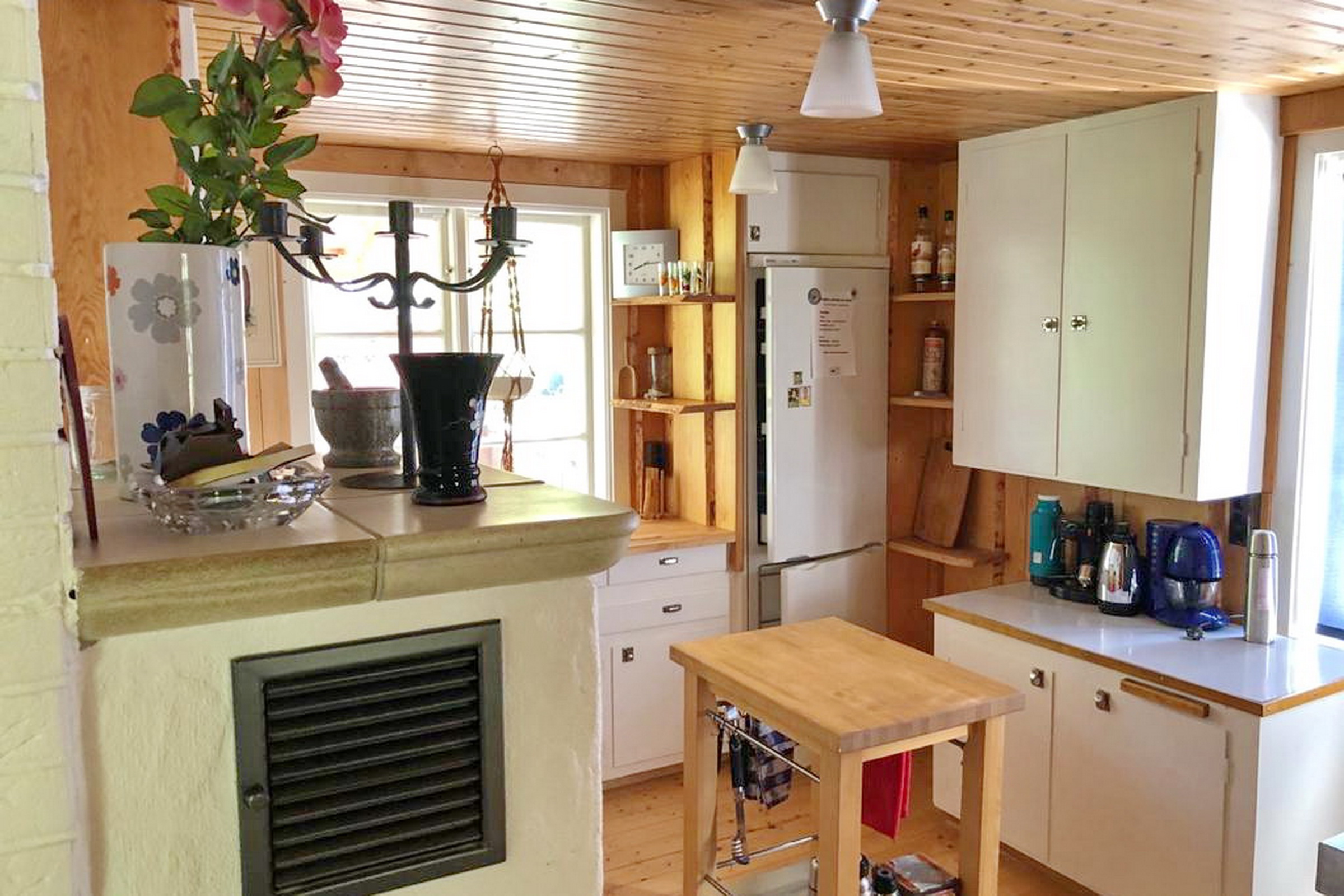 Eingangsveranda / Flur / Abstellraum mit Waschmaschine / Küche mit E-Herd, Holzherd, Kühl-Gefrierschrank und Geschirrspüler sowie Kachelofen / Wohnzimmer mit Kaminofen und Ausgang zur überdachten Terrasse / Schlafzimmer mit integriertem Bad mit WC und Dusche mit Fußbodenheizung im Fliesenbereich, Ausgang zur Terrasse