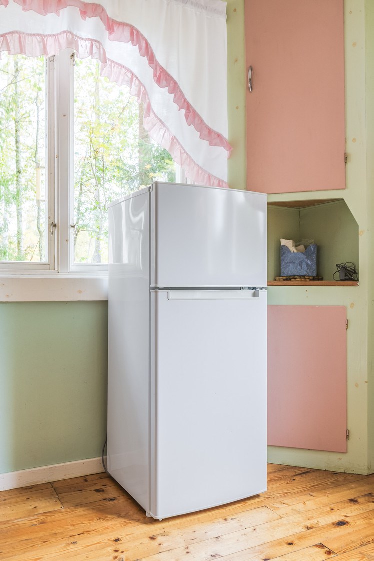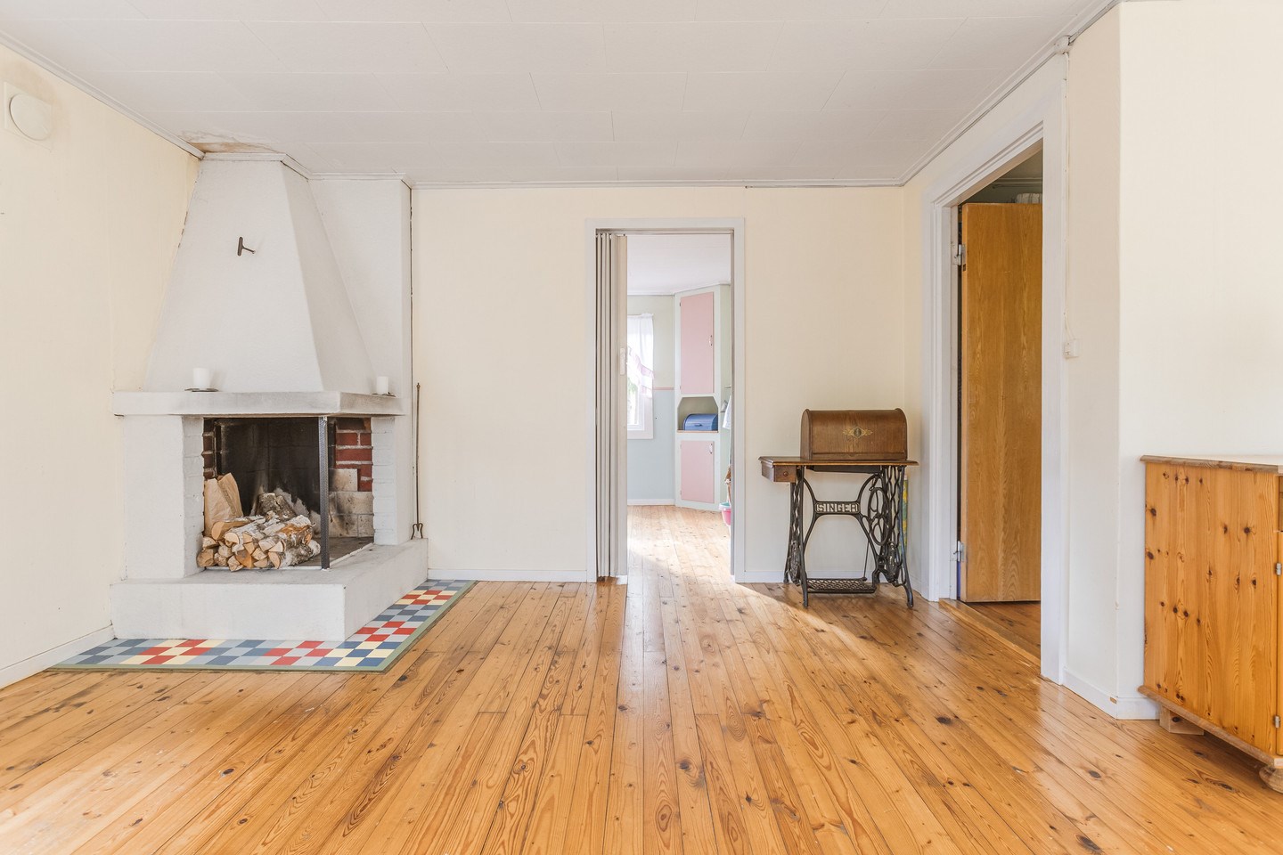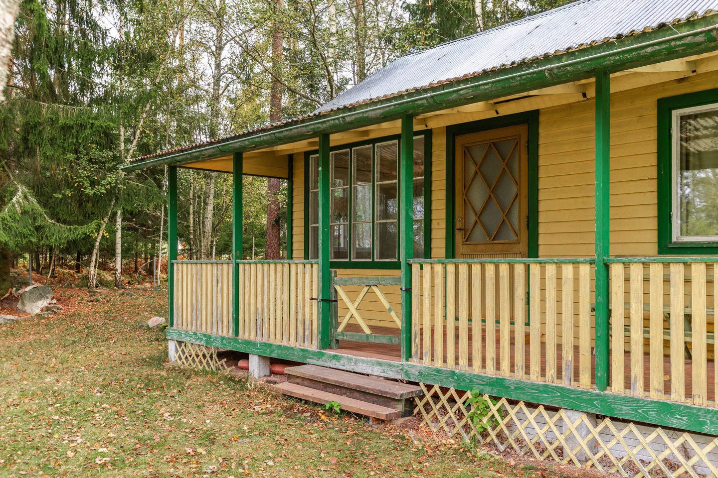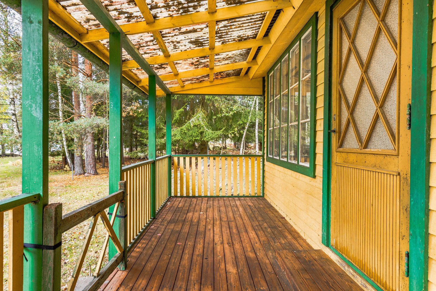 überdachte Veranda / Flur / Wohnzimmer mit offenem Kamin / Küche mit Tisch-E-Herd, Holzherd und Kühl-Gefrierschrank / Schlafzimmer