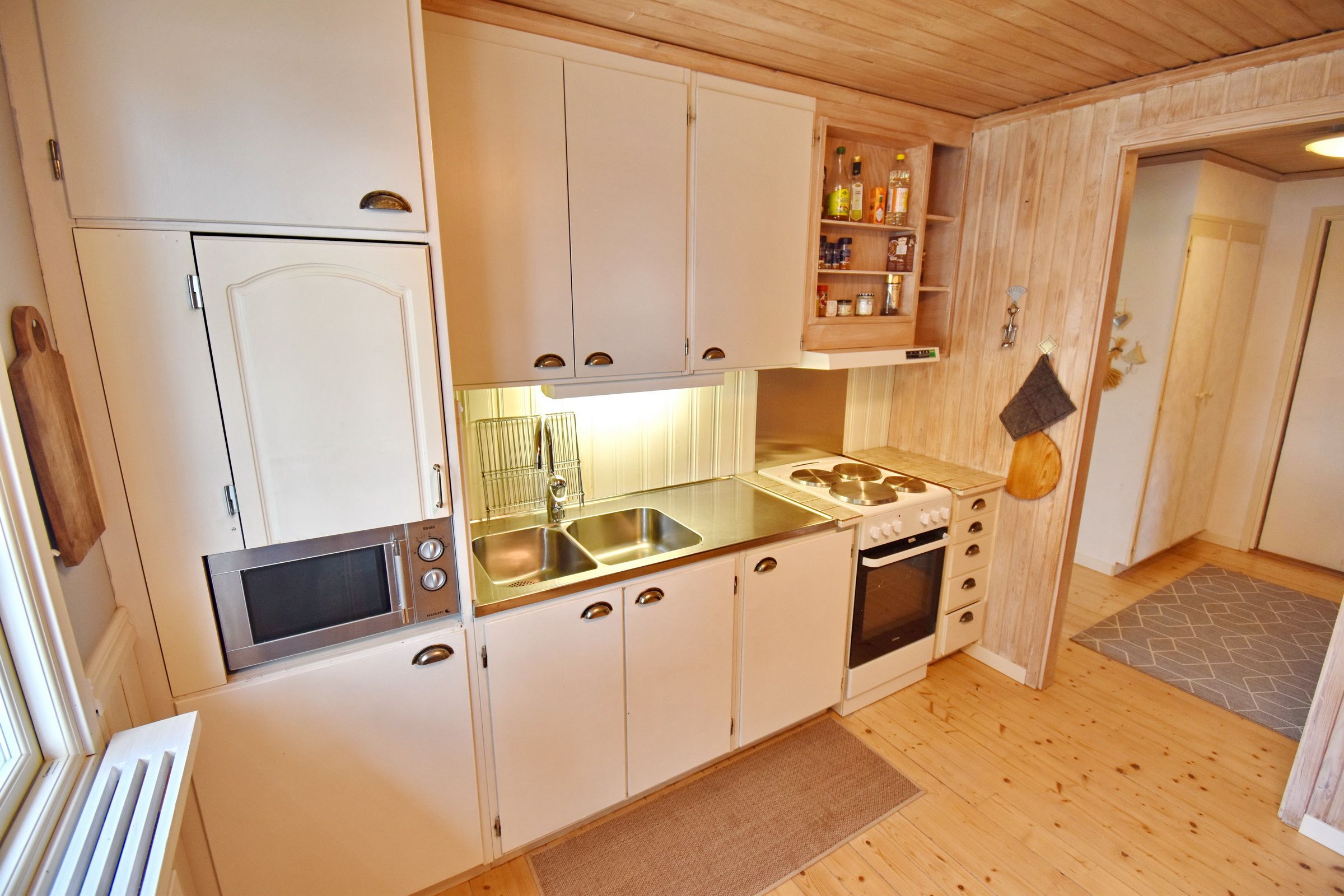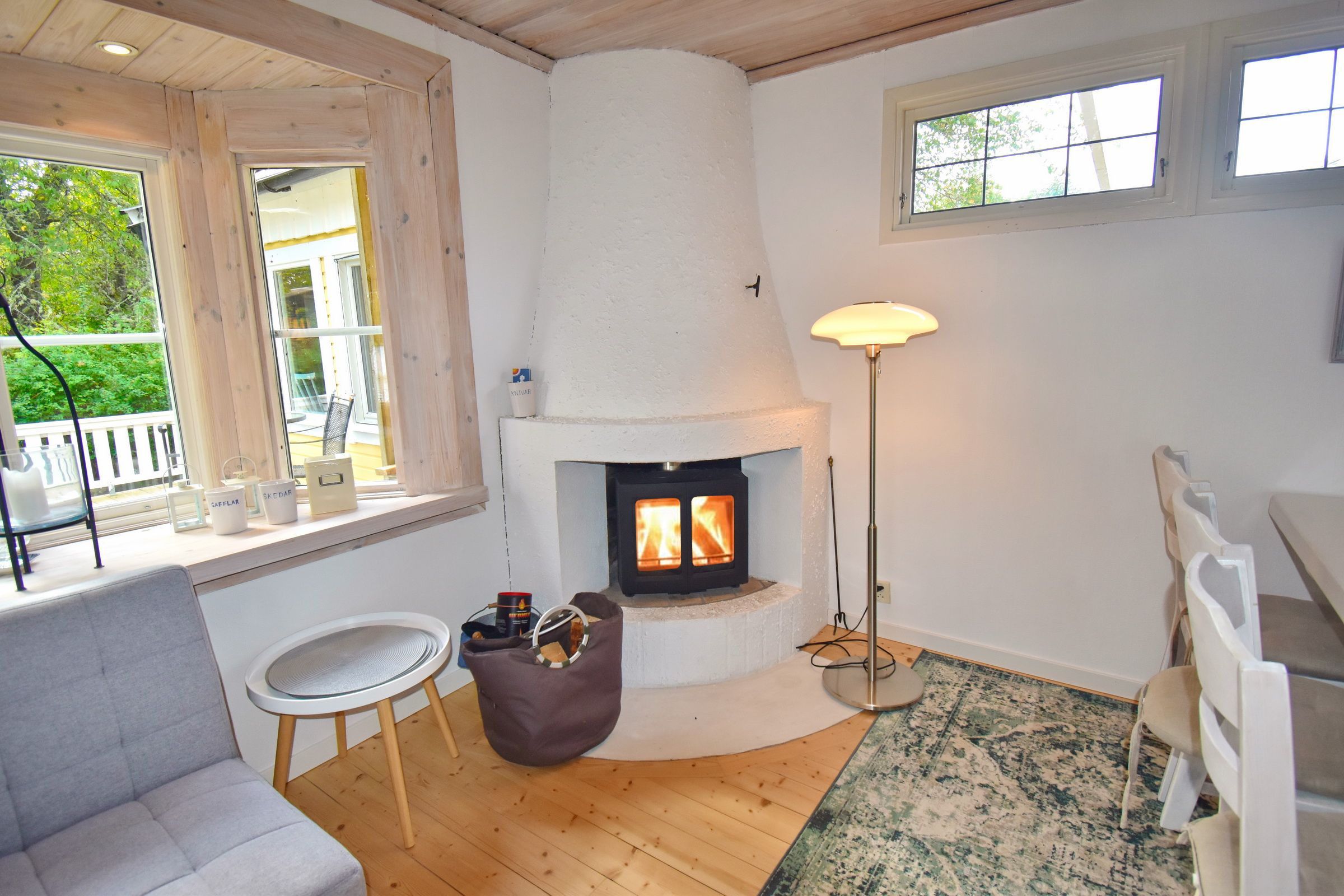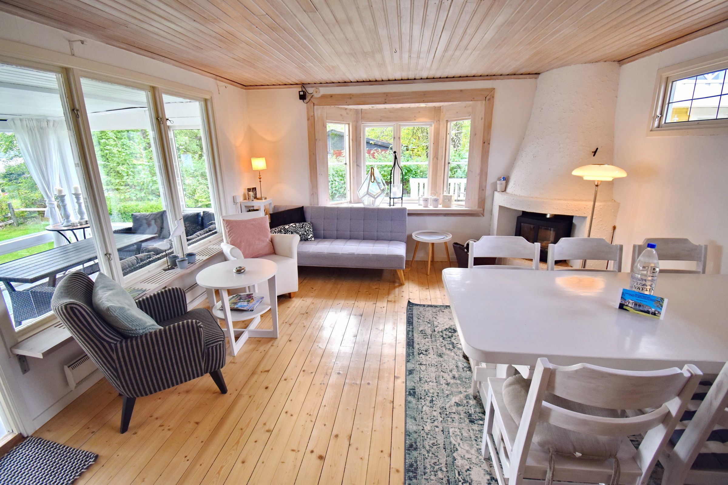 Flur / Wohnzimmer mit Kamin und Ausgang zum Wintergarten / Küche mit E-Herd, Mikrowelle und Kühl-Gefrierschrank / 2 Schlafzimmer / Badezimmer mit WC, Waschmaschine und Dusche // 2 Terrassen