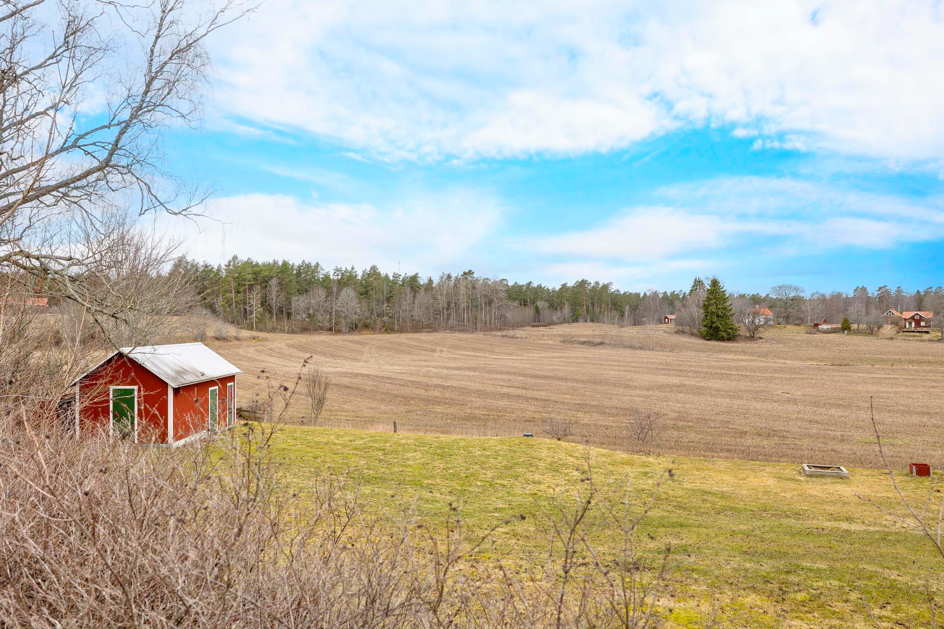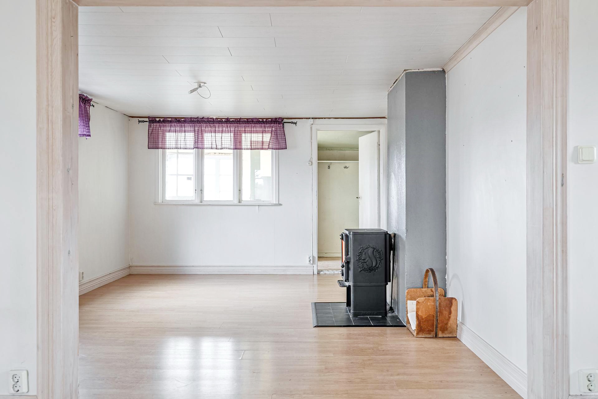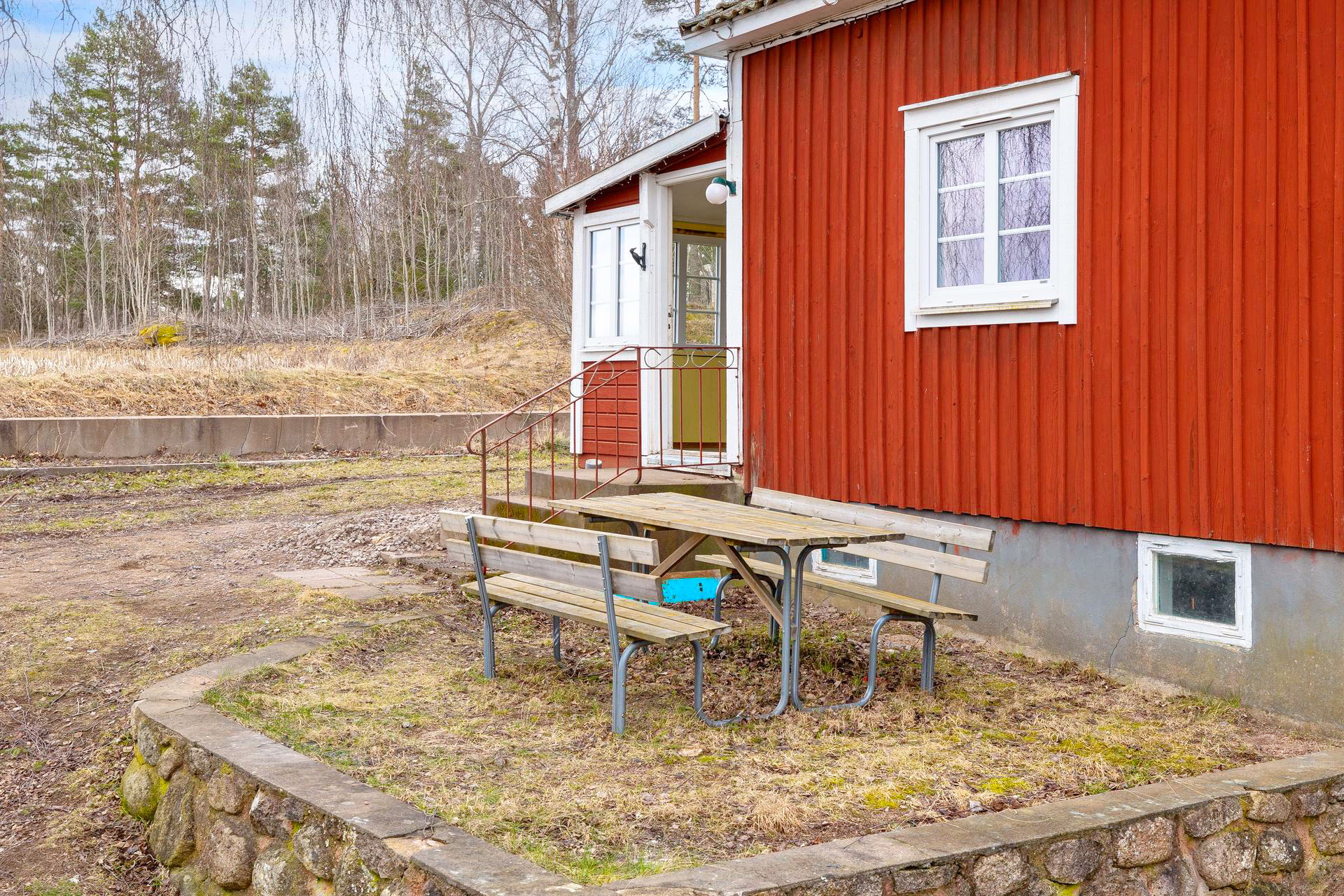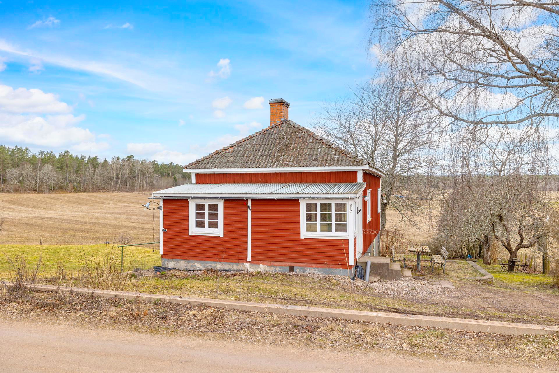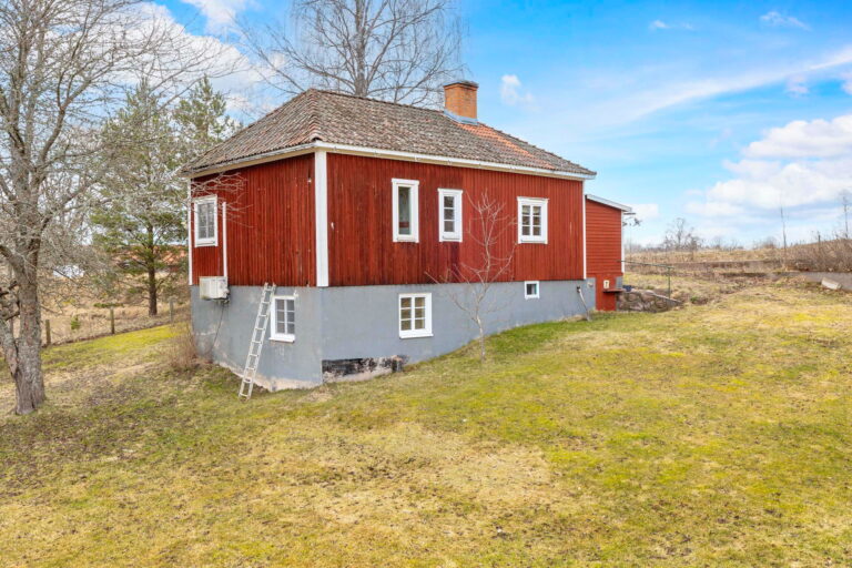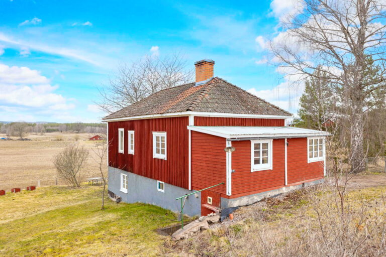 Älteres rot-weißes Holzhaus Nähe Vimmerby mit schönem Ausblick in die Landschaft! Wasser/Abwasser und Badezimmer renoviert. 69 m² Wohnfläche + Vollkeller. Garten mit Abstellschuppen.