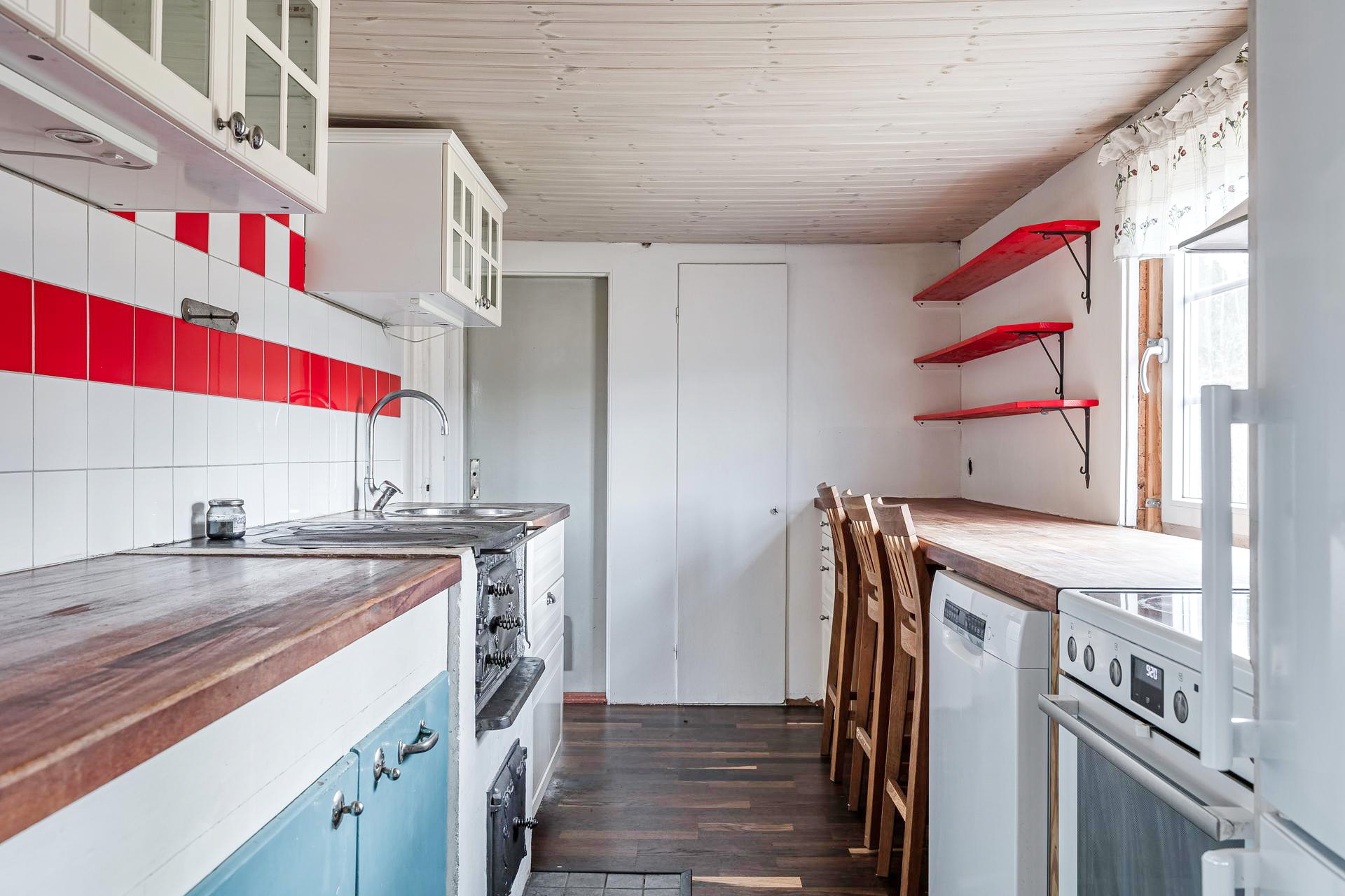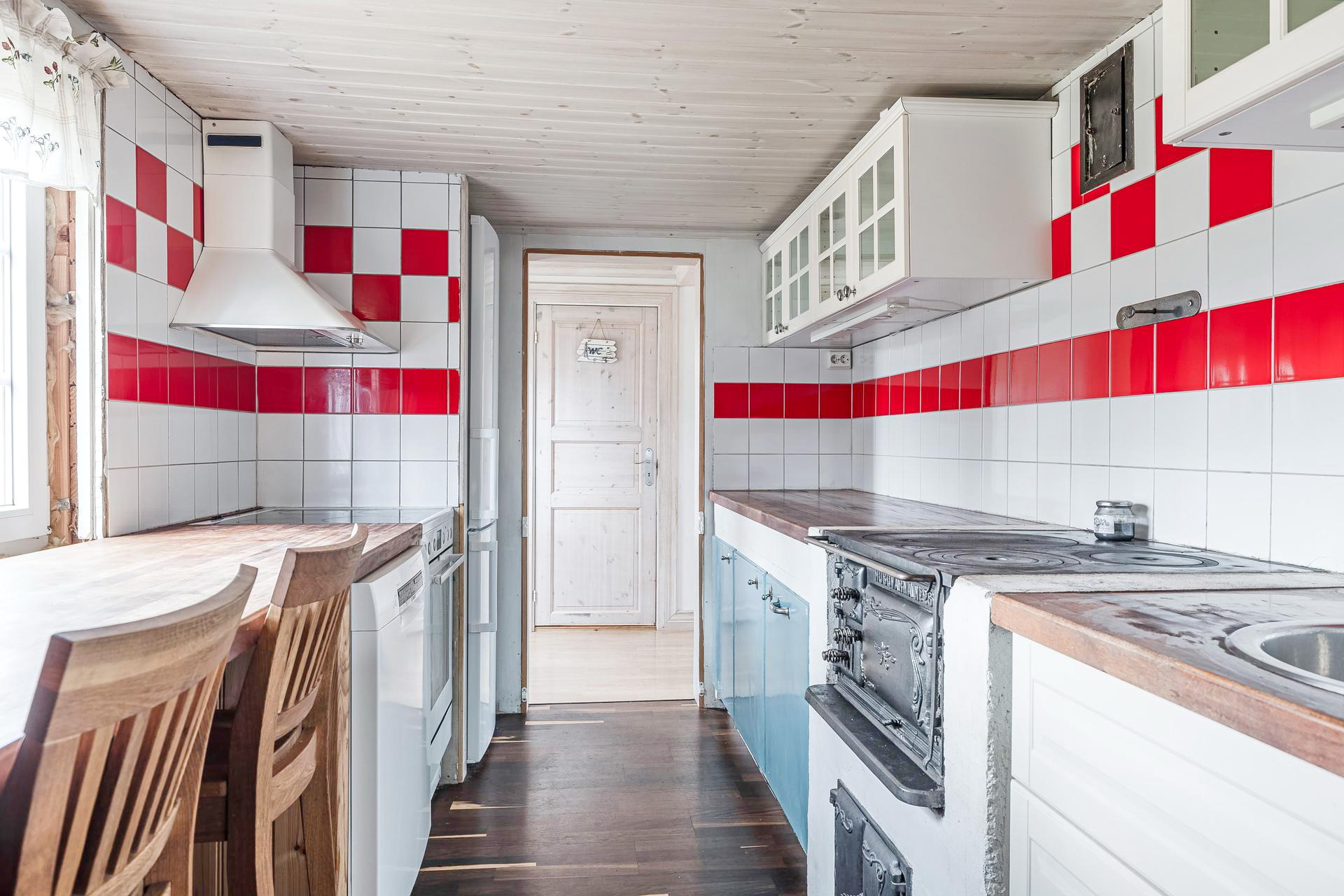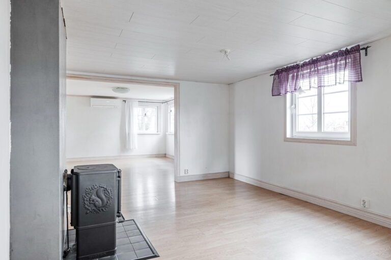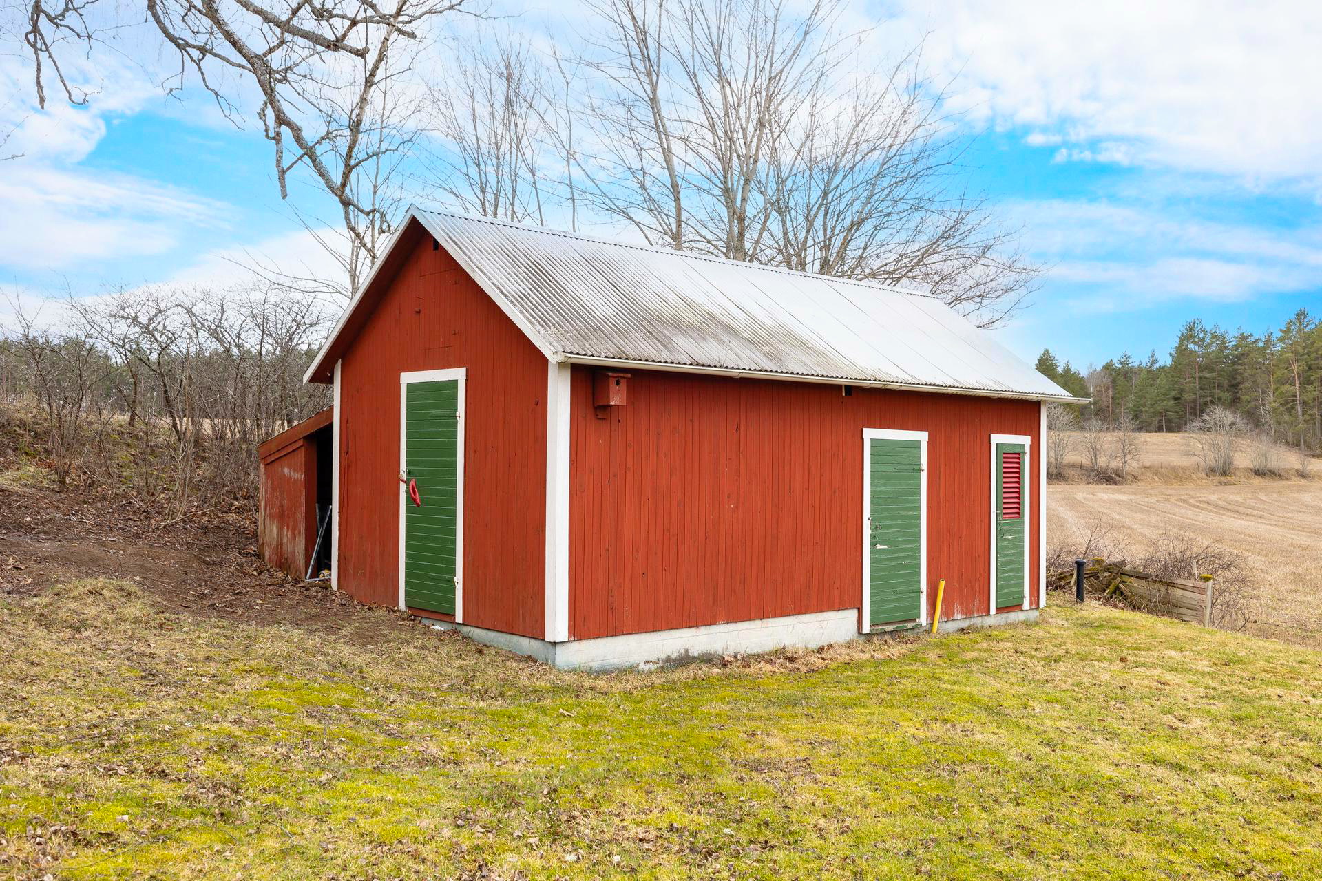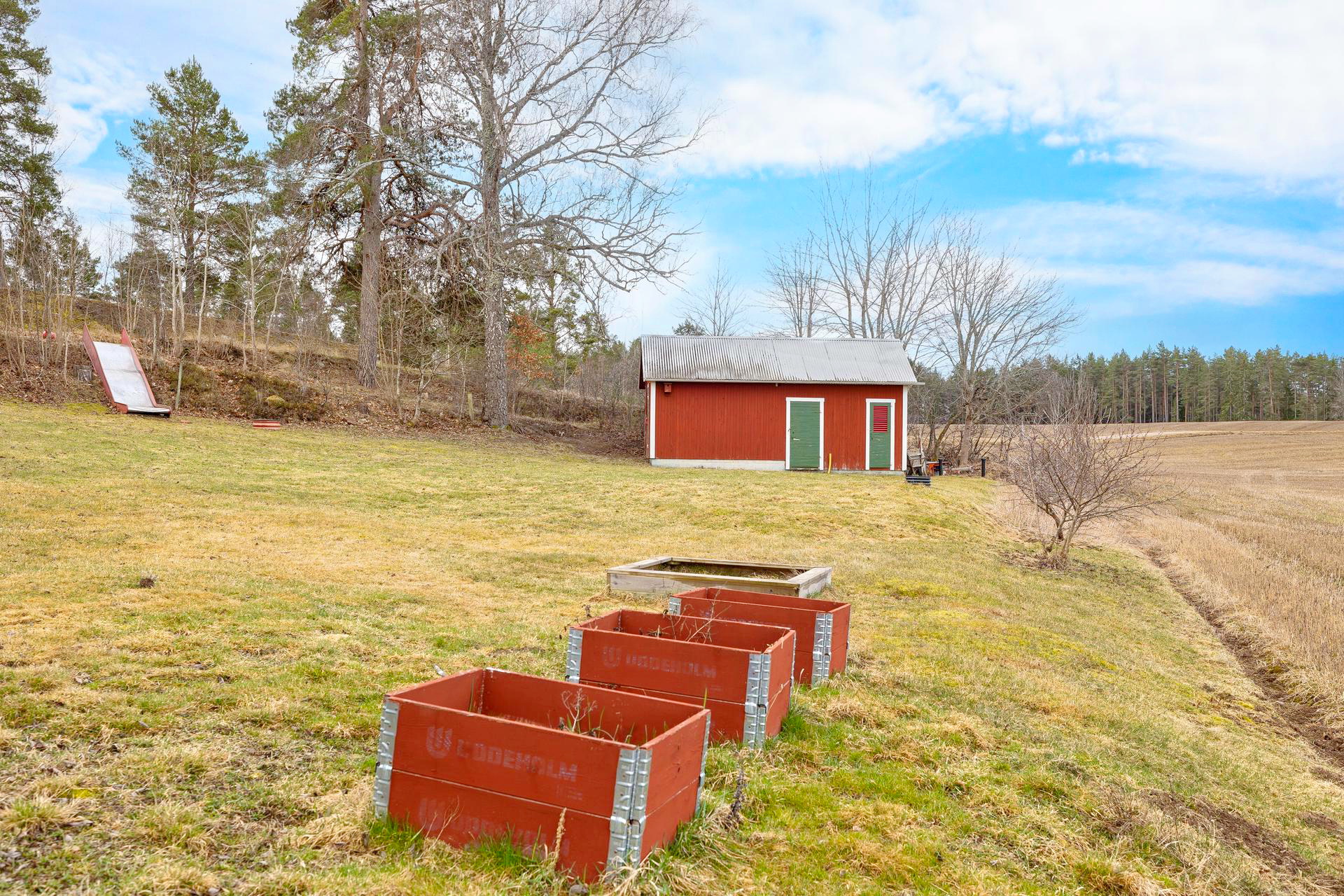 Älteres rot-weißes Holzhaus Nähe Vimmerby mit schönem Ausblick in die Landschaft! Wasser/Abwasser und Badezimmer renoviert. 69 m² Wohnfläche + Vollkeller. Garten mit Abstellschuppen.