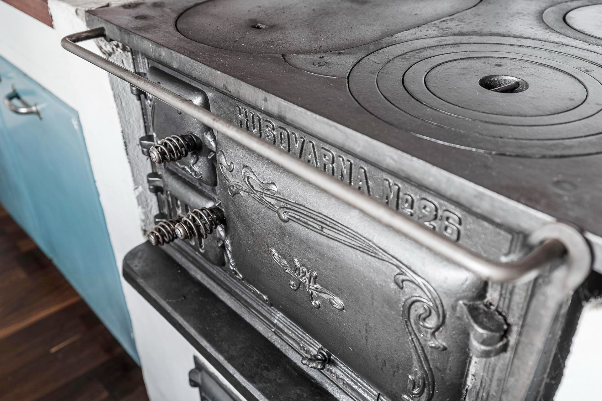 Flur / Wohnzimmer mit Kaminofen / Esszimmer / Küche mit E-Herd, Holzherd, Kühl-Gefrierschrank und Geschirrspüler / Badezimmer mit WC und Dusche, Fußbodenheizung
