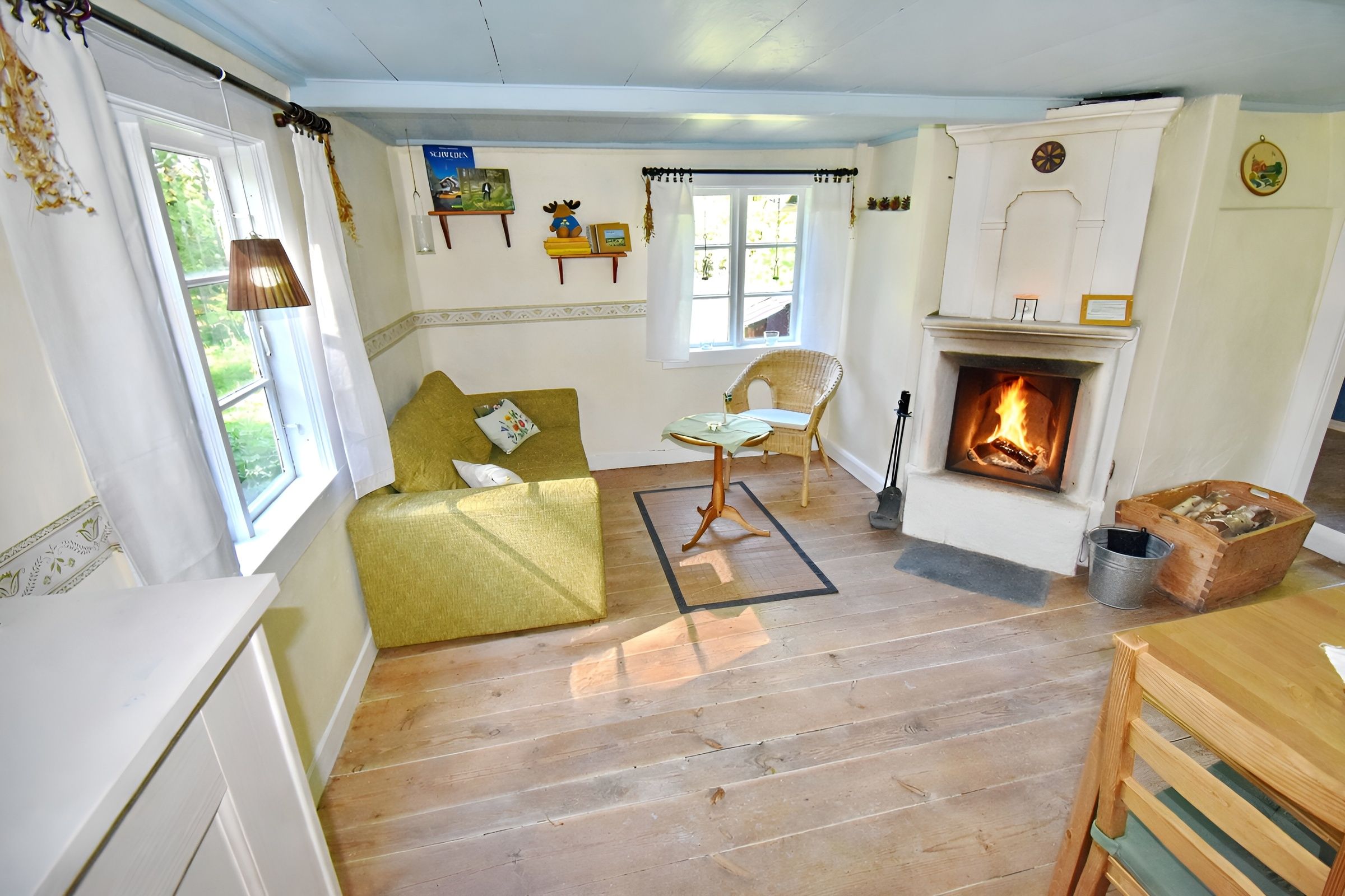 Das Häuschen verfügt über ein schön eingerichtetes Wohnzimmer mit Essplatz und Sofaecke mit einem Kamin für gemütliche Abende am knisternden Feuer. Wenn Sie Ihren Kindern hier die Geschichten von Astrid Lindgren vorlesen, fühlen Sie sich garantiert wie in der Zeit zurückversetzt. Vom Wohnzimmer aus gelangen Sie in die Küche mit Gaskühlschrank und Gasherd mit 4 Kochfeldern und Backofen sowie einem traditionellen Holzherd. Im Obergeschoss gibt es ein urgemütliches Schlafzimmer mit Doppelbett sowie ein Kinderzimmer mit Etagenbett. Im separaten Toilettenhäuschen finden Sie die Trockentoilette und eine Pumpdusche. Zusätzlich gibt es eine Solar-Außendusche im Garten.