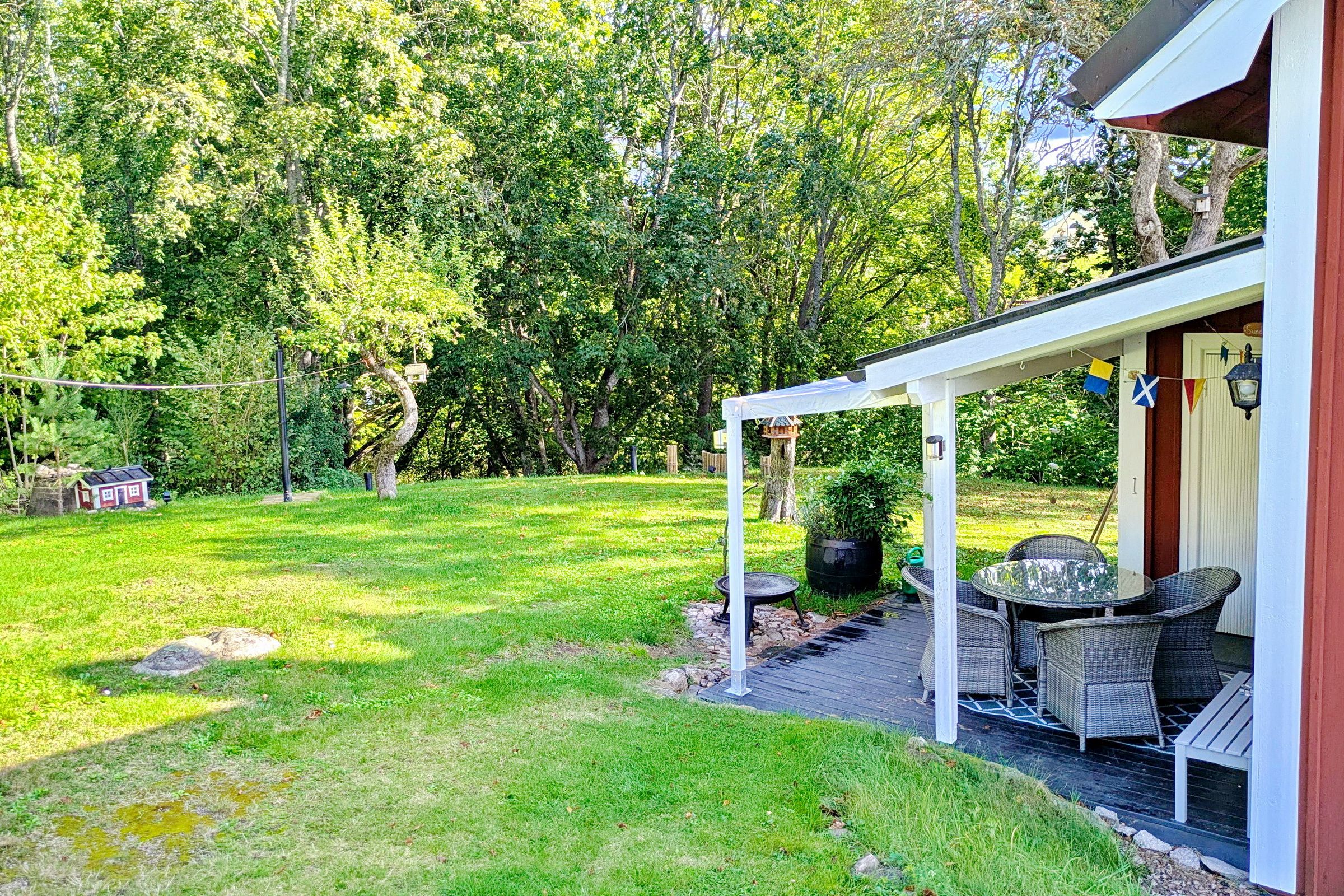 Von der teilüberdachten Veranda am Haus haben Sie einen schönen Blick in den Garten und in die angrenzende Natur. Auf dem Wiesengrundstück können Kinder unter den Apfelbäumen spielen.