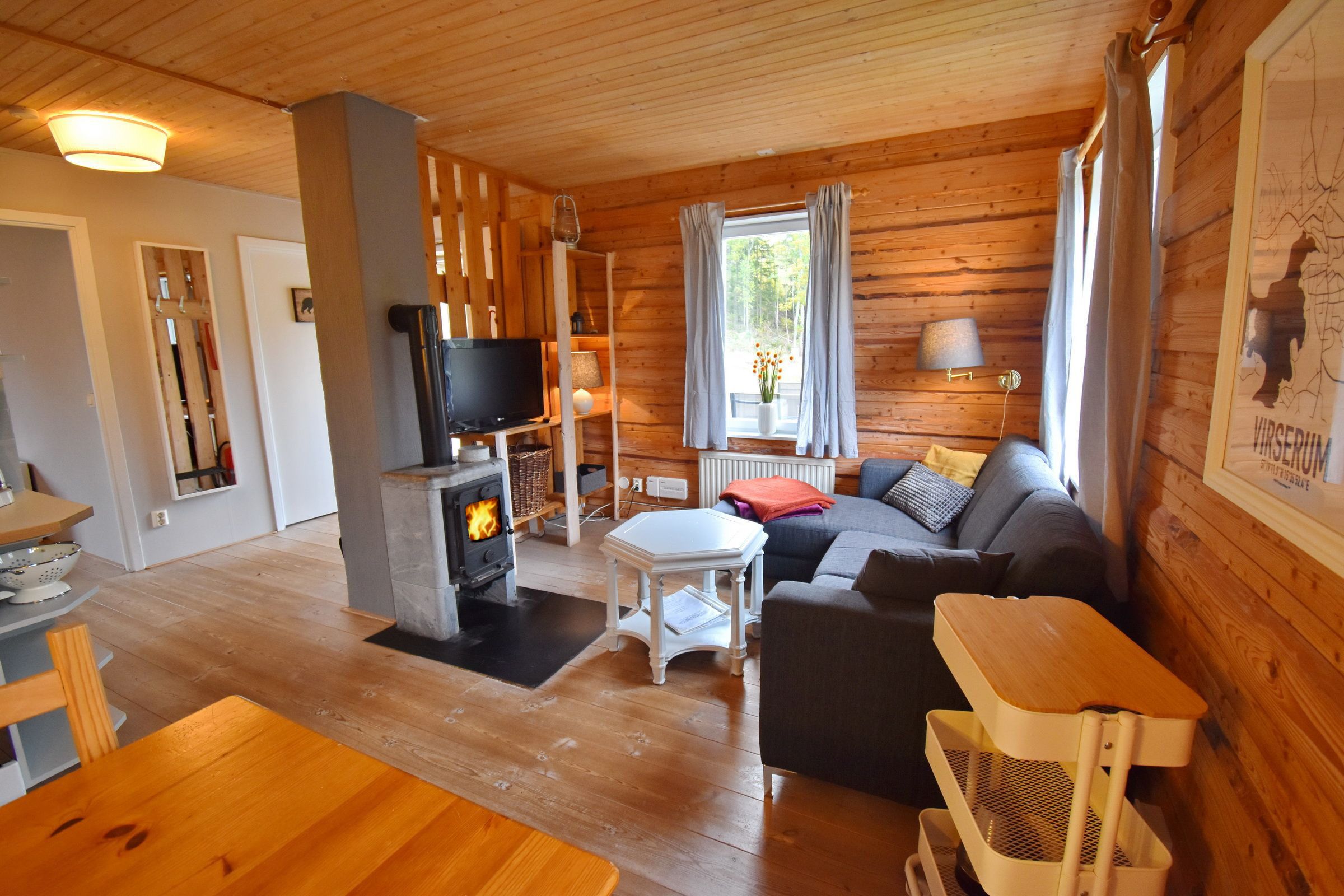 Flur / Wohnzimmer mit Kaminofen und TV (schwedische Programme) / integrierte Küche mit E-Herd, Kühlschrank und Essplatz (Gefriertruhe im Nebengebäude, gemeinsam mit den Nachbarn) / Schlafzimmer mit Doppelbett / Schlafzimmer mit Etagenbett / Badezimmer mit WC und Dusche // Veranda