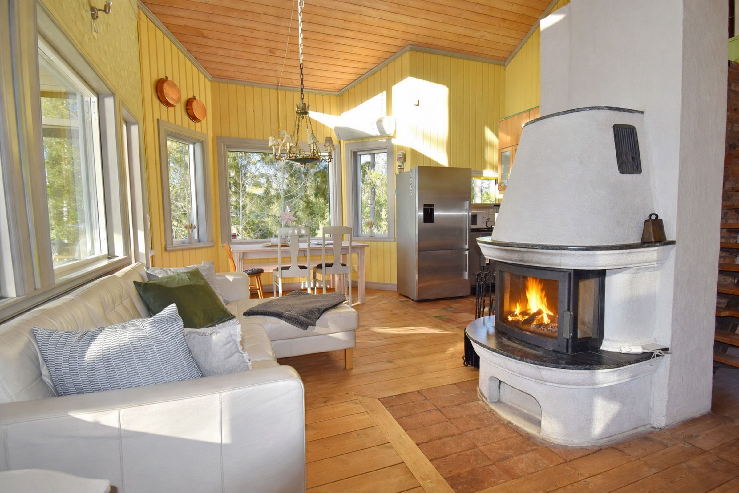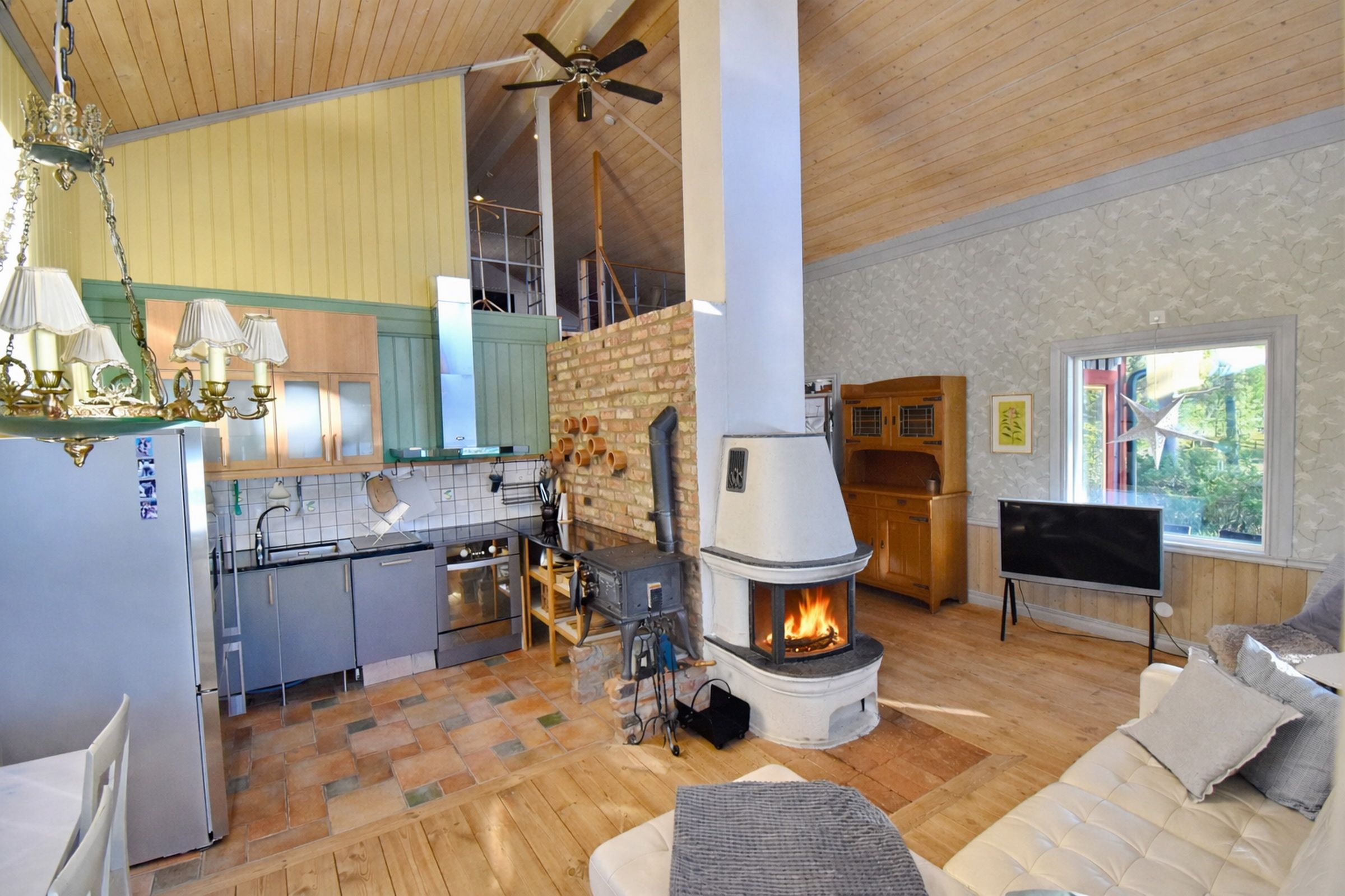 Vorflur mit Waschmaschine / Wohn- und Esszimmer mit Kamin und Smart-TV / integrierte Küche mit E-Herd, Kühl-Gefrierschrank, Geschirrspüler / Schlafzimmer mit Doppelbett / Schlafzimmer mit Etagenbett / offener Schlafboden mit Doppelbett / Badezimmer mit WC und Dusche / Wintergarten mit Seeblick