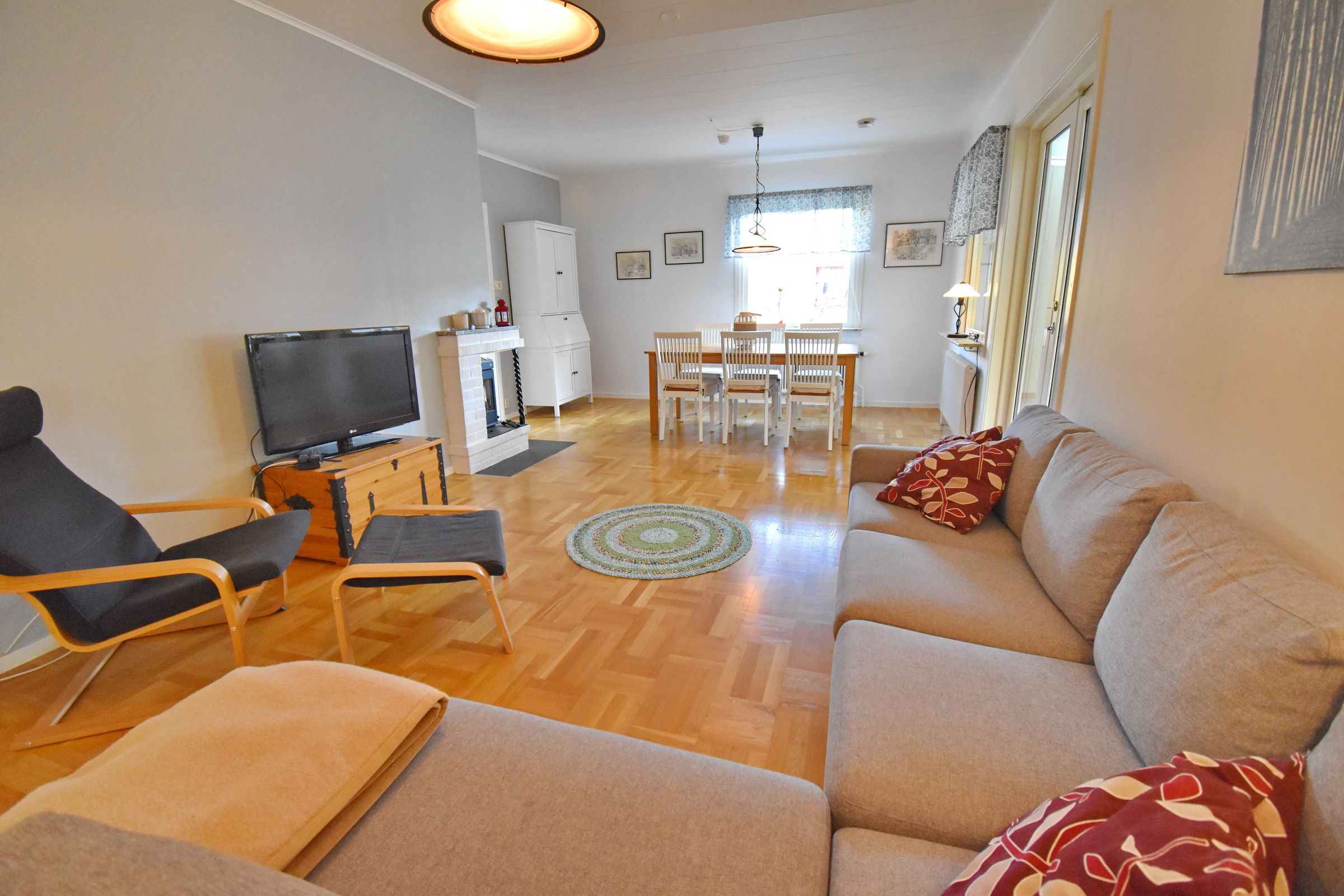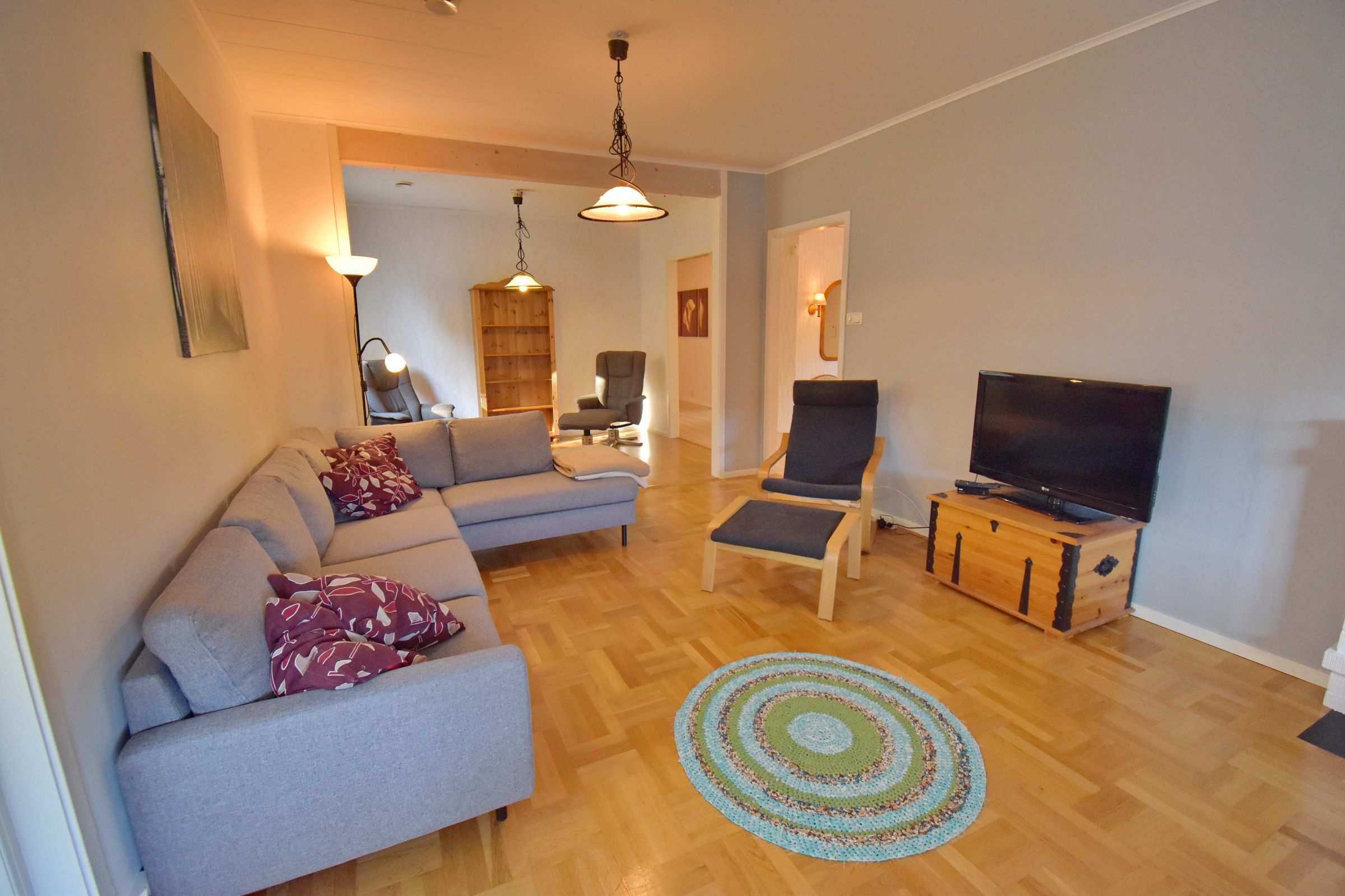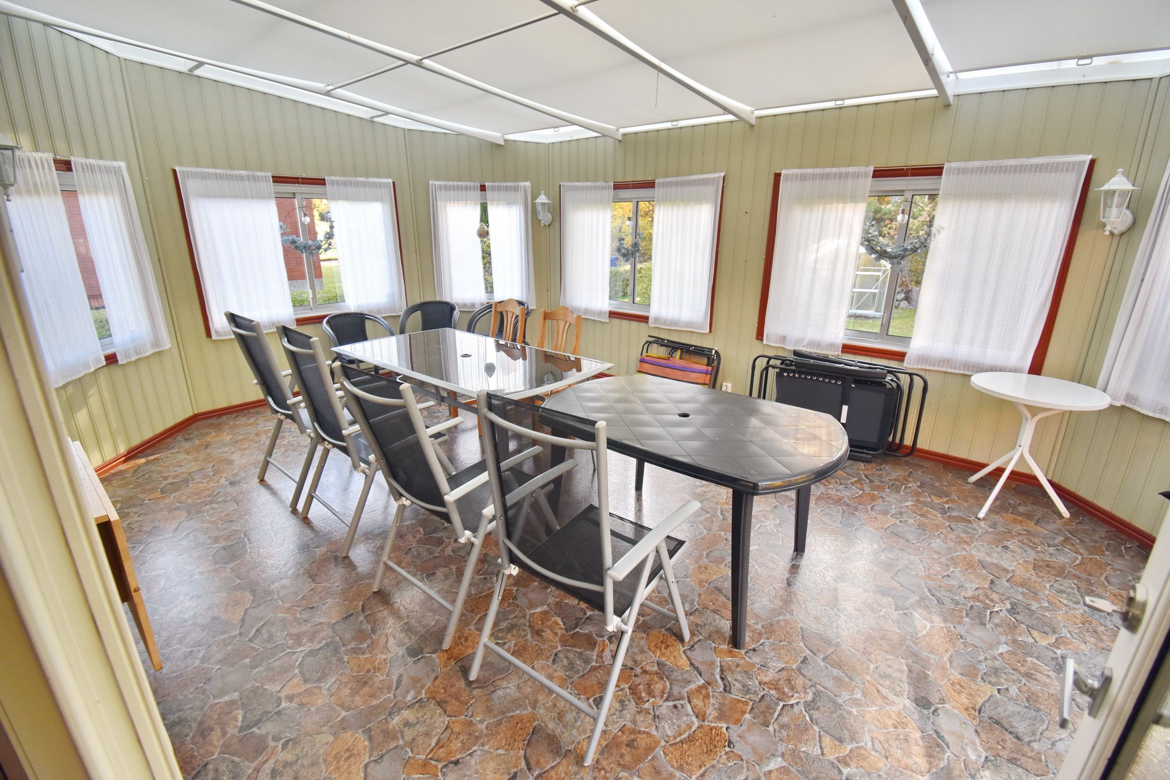 Flur / Küche mit E-Herd, Kühlschrank (+ Gefrierschrank im Keller), Geschirrspüler, Mikrowelle, Essplatz / Wohn- und Esszimmer mit Kamin und deutschem Sat-TV / Wintergarten mit Esstisch und Ausgang zum Garten / 2 Schlafzimmer mit Doppelbetten / 1 Schlafzimmer mit 140cm-Bett / 1 Schlafzimmer mit Etagenbett / Badezimmer mit WC und Dusche // Souterrain mit zweitem Badezimmer mit WC und Dusche / Waschraum mit Waschmaschine und Trockner / Aufenthaltsraum