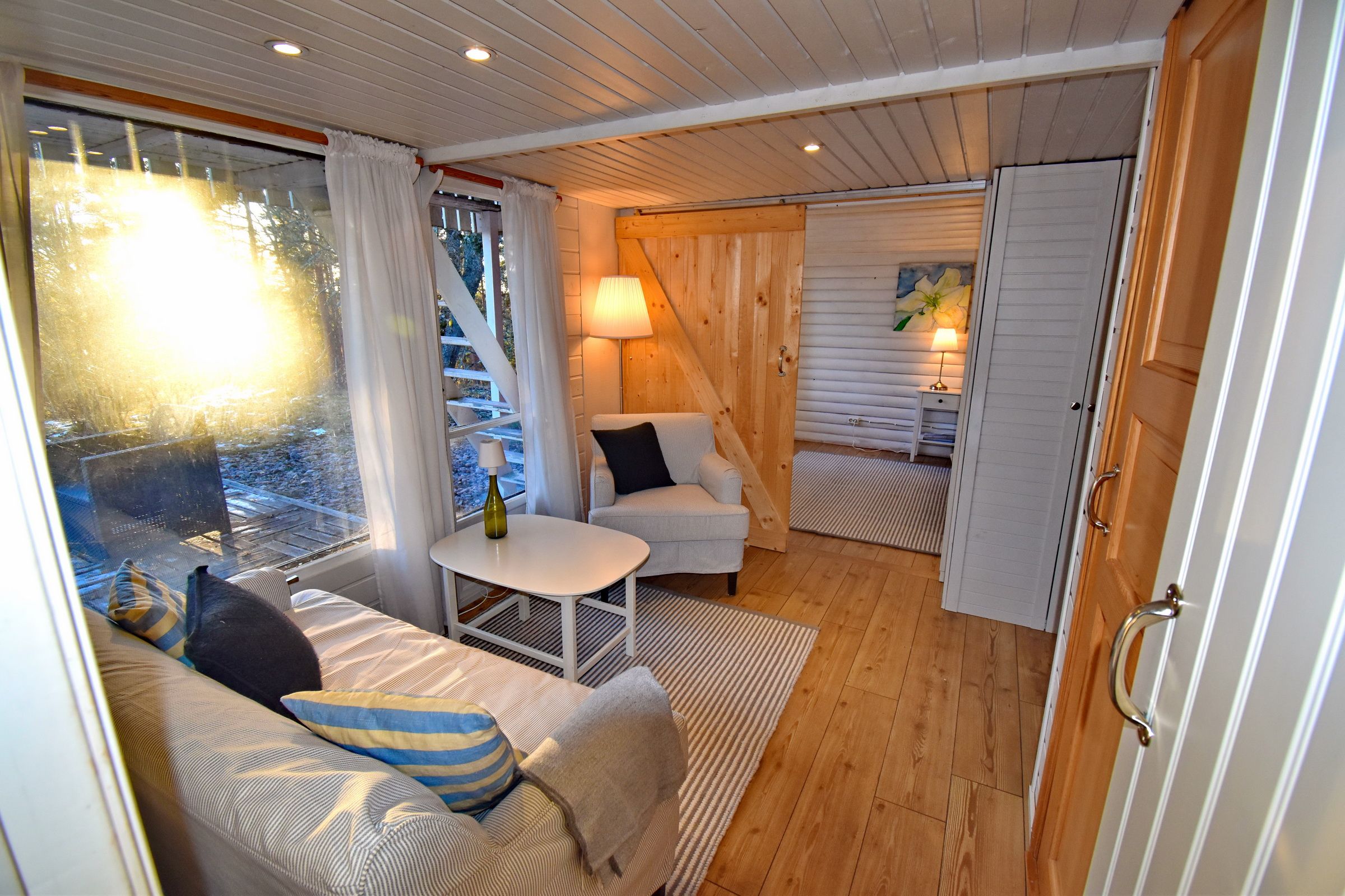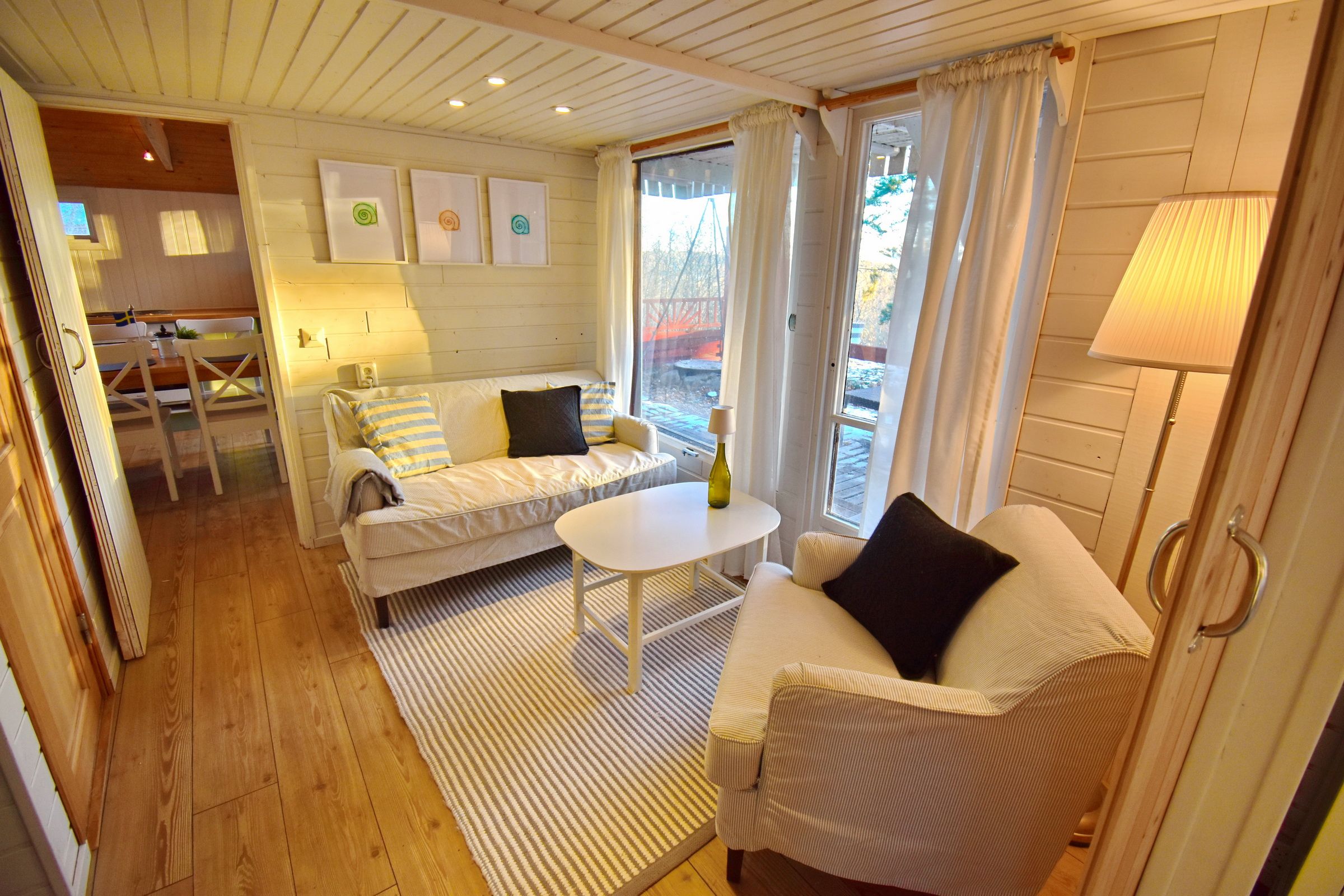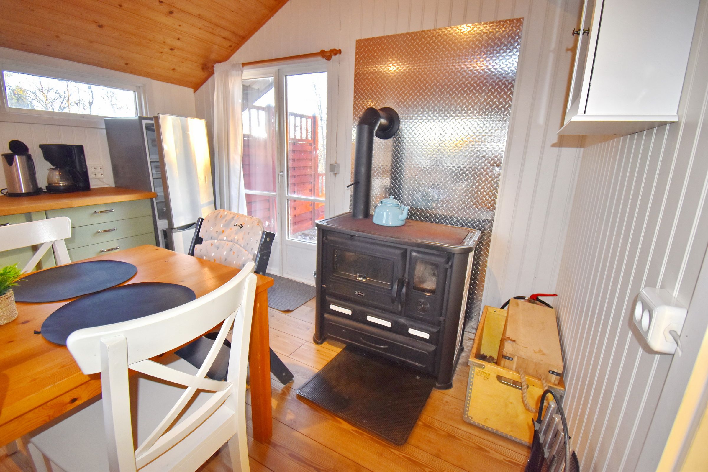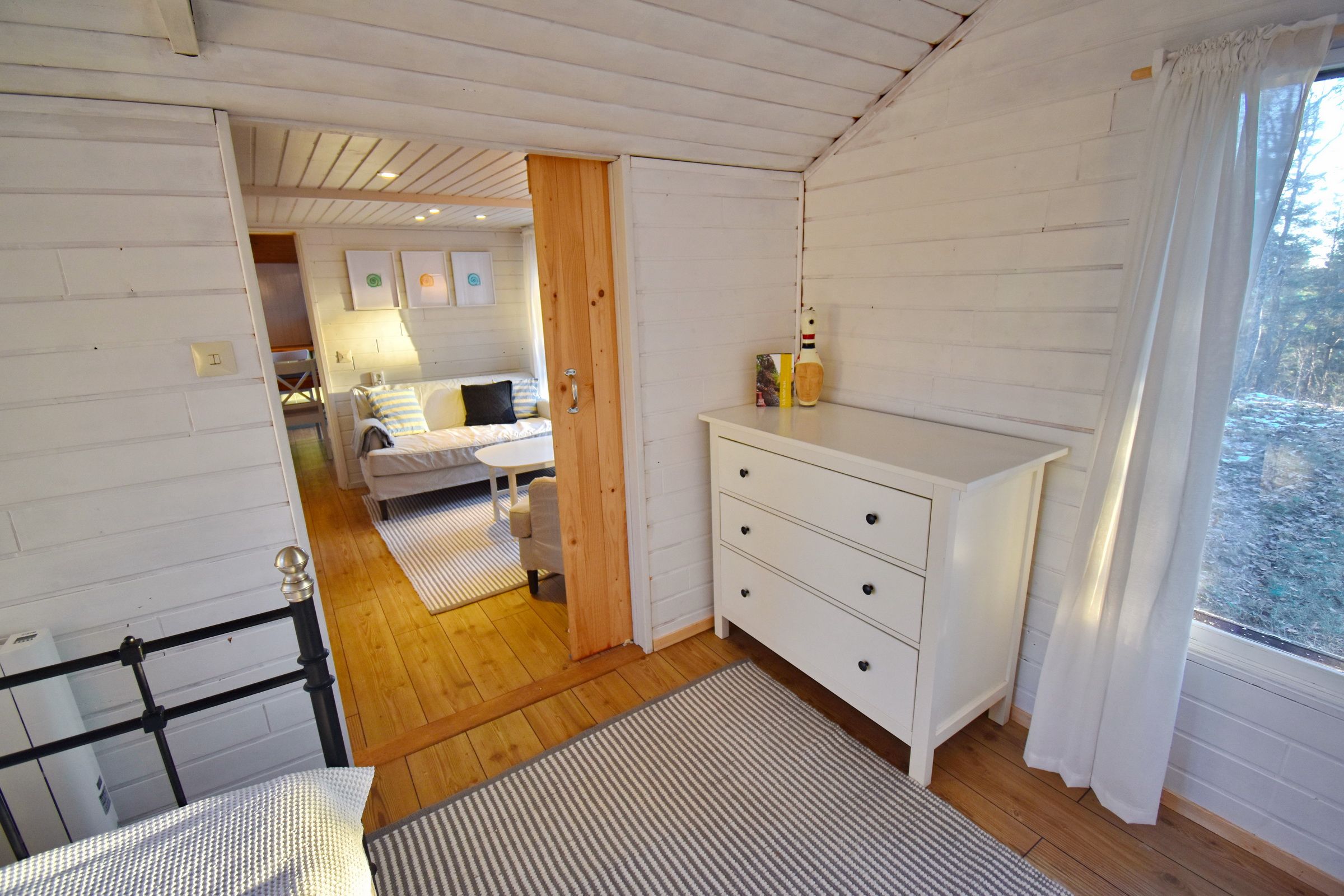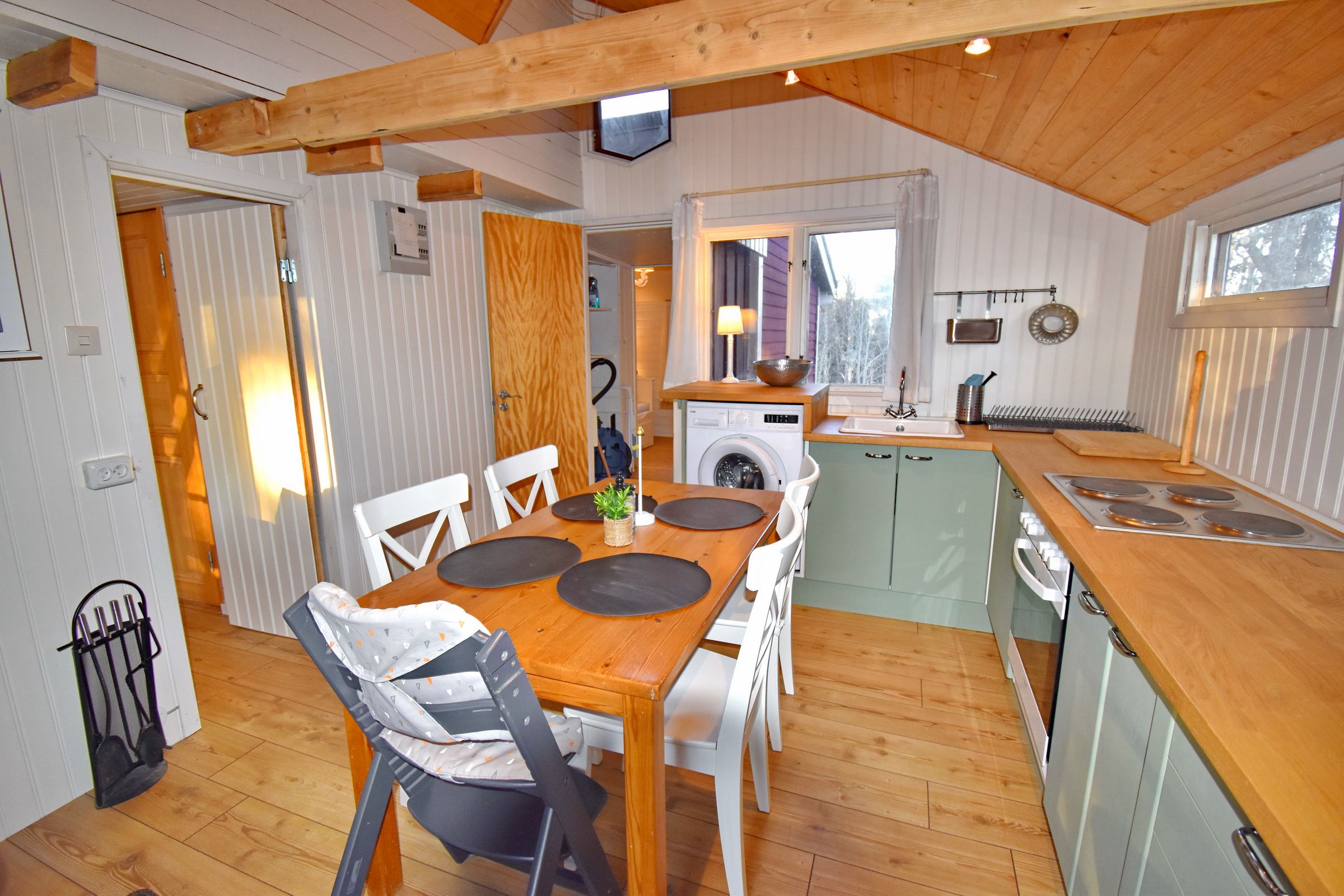 Flur / kleines Wohnzimmer / Küche mit E-Herd, Holzofen, Waschmaschine, Geschirrspüler und Kühl-Gefrierschrank / Schlafzimmer mit Doppelbett / Schlafzimmer mit Ausziehbett für 2 Personen / Duschraum mit Dusche und Waschbecken / WC (Zugang von außen, neben der Eingangstür) / Terrasse mit Blick zum See (500m entfernt) / Schafboden unter dem Dach (Zugang nur von außen über die Terrasse)