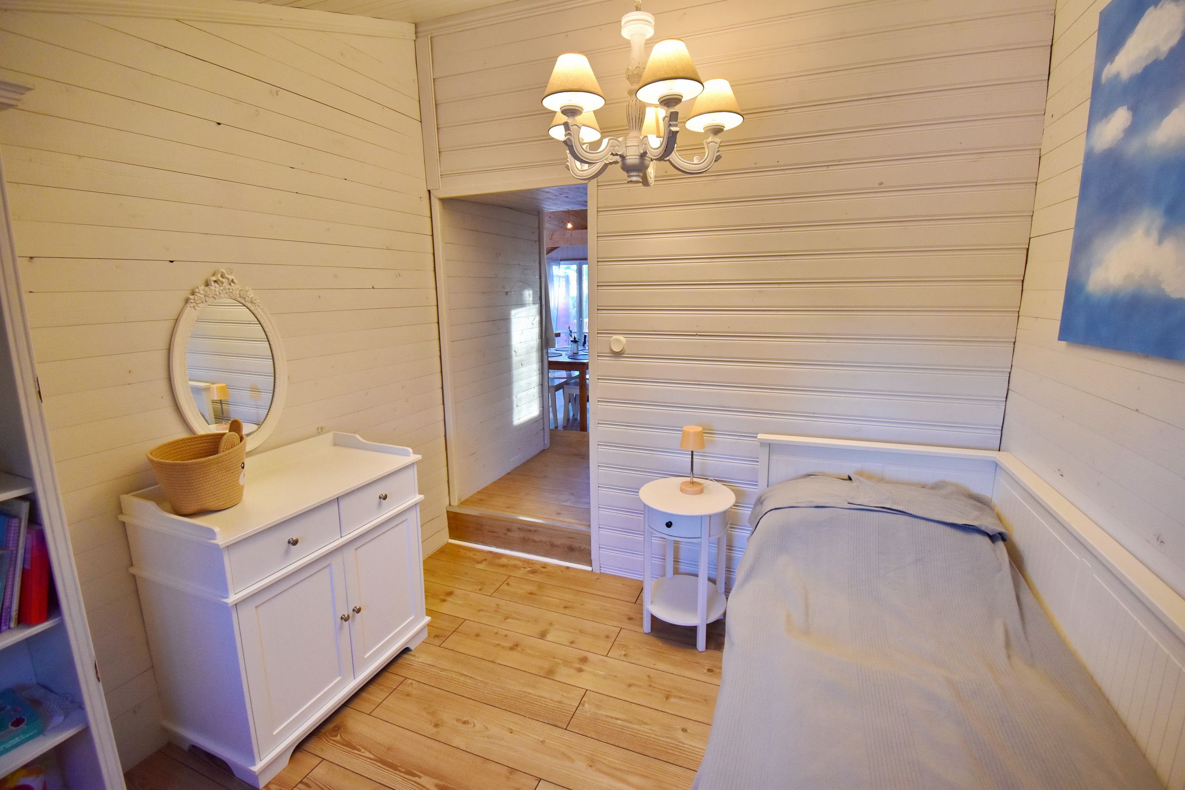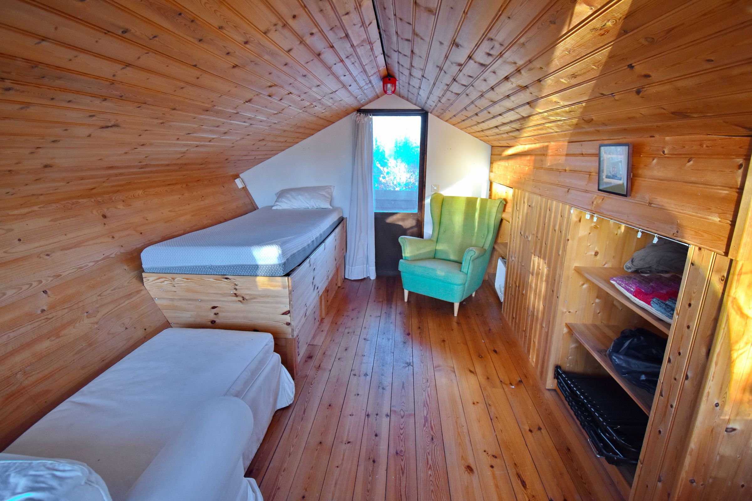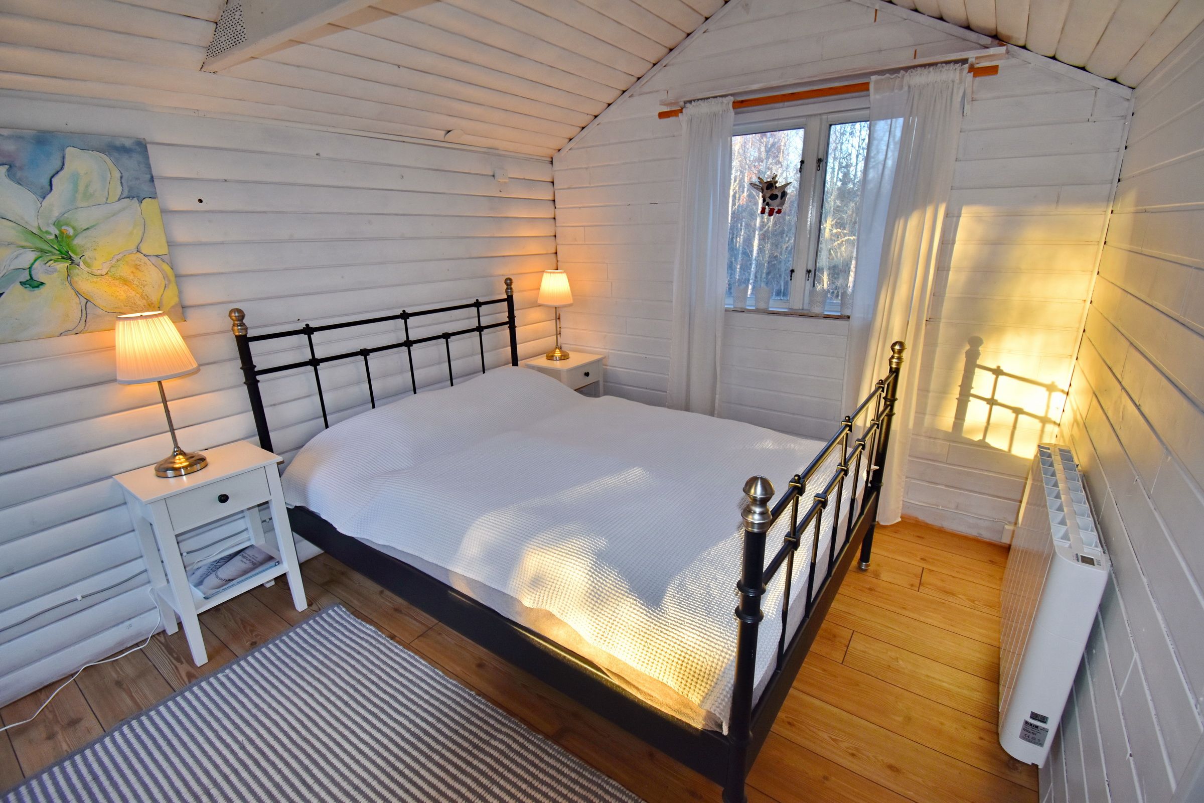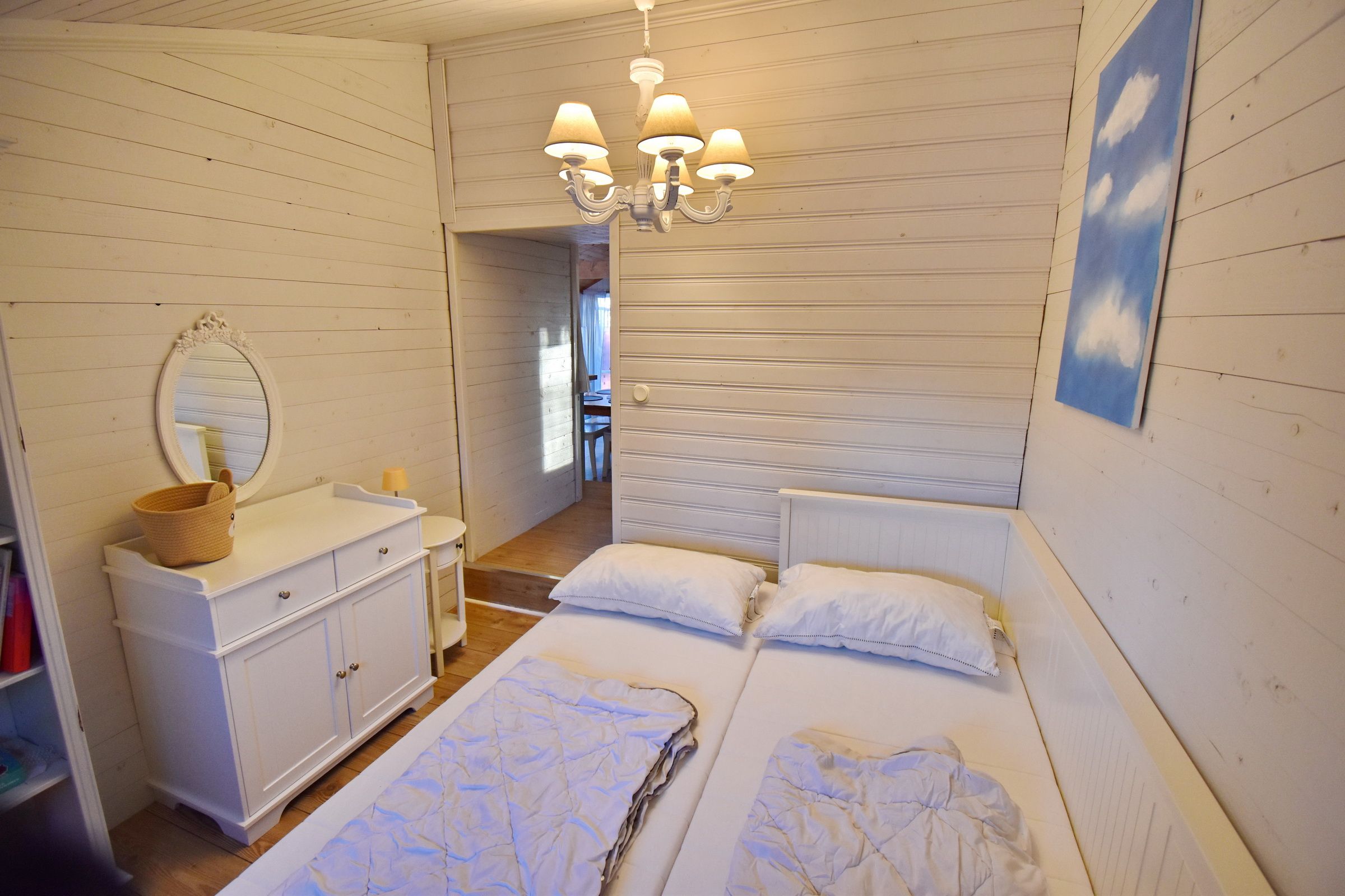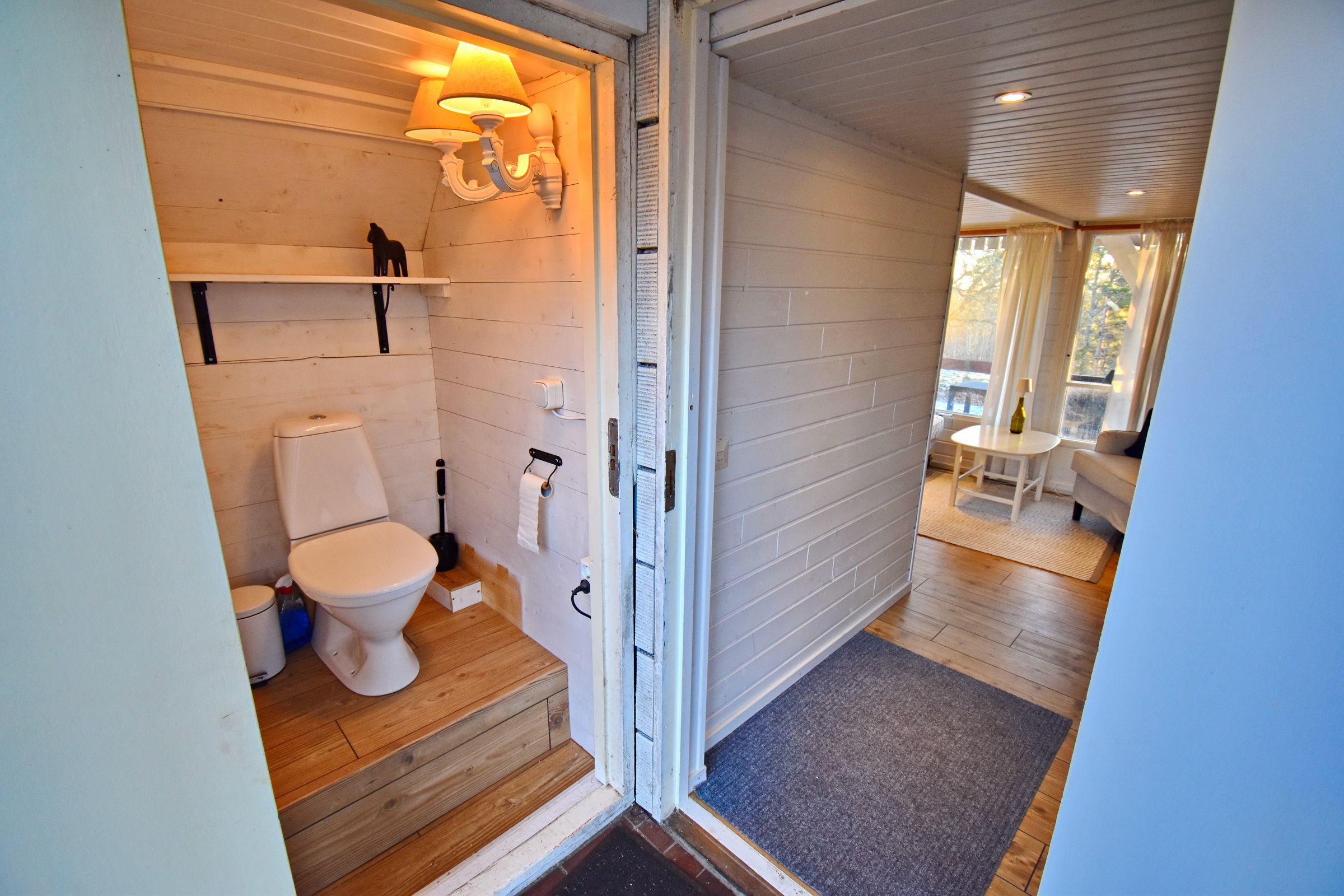 Flur / kleines Wohnzimmer / Küche mit E-Herd, Holzofen, Waschmaschine, Geschirrspüler und Kühl-Gefrierschrank / Schlafzimmer mit Doppelbett / Schlafzimmer mit Ausziehbett für 2 Personen / Duschraum mit Dusche und Waschbecken / WC (Zugang von außen, neben der Eingangstür) / Terrasse mit Blick zum See (500m entfernt) / Schafboden unter dem Dach (Zugang nur von außen über die Terrasse)