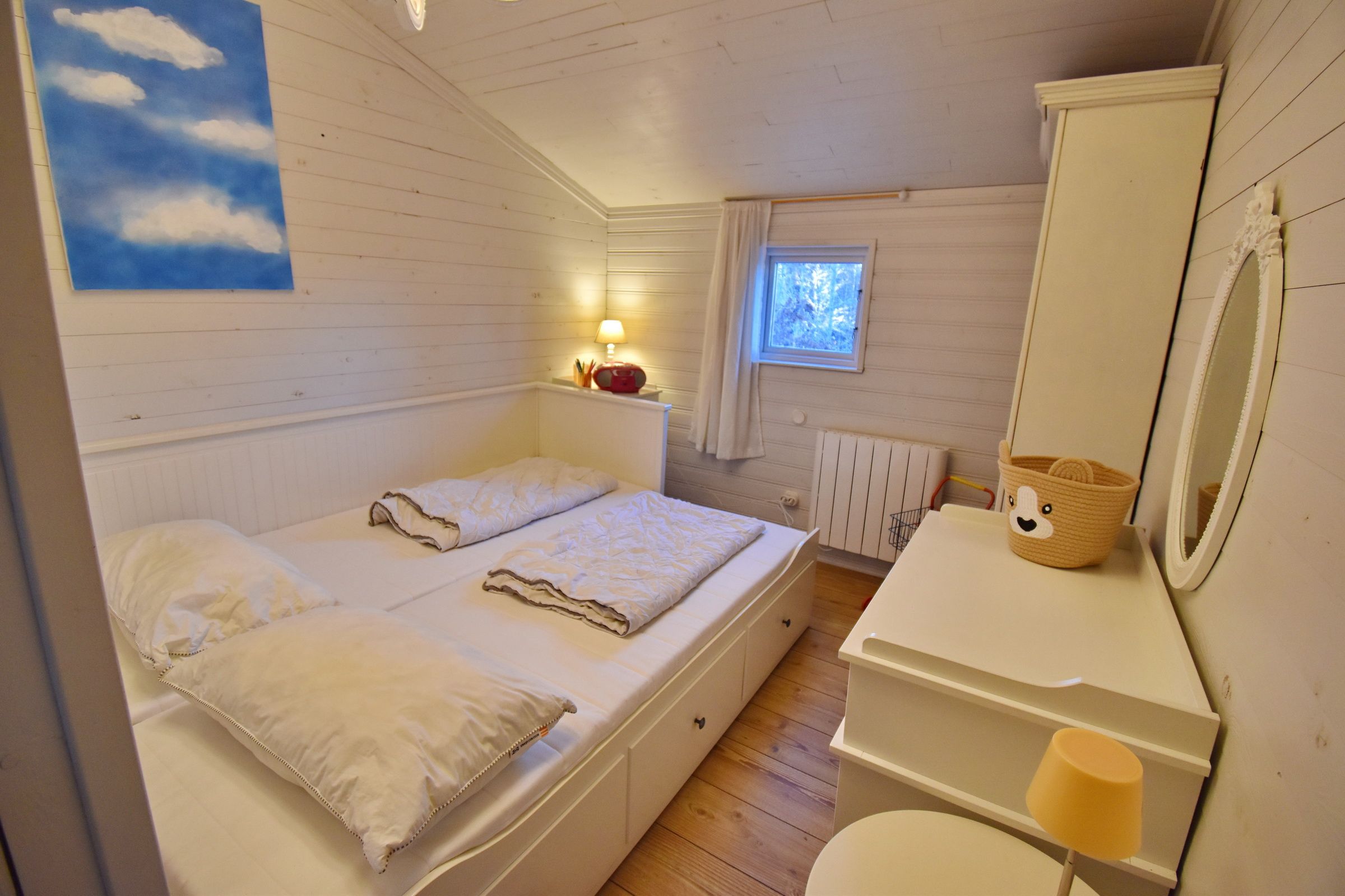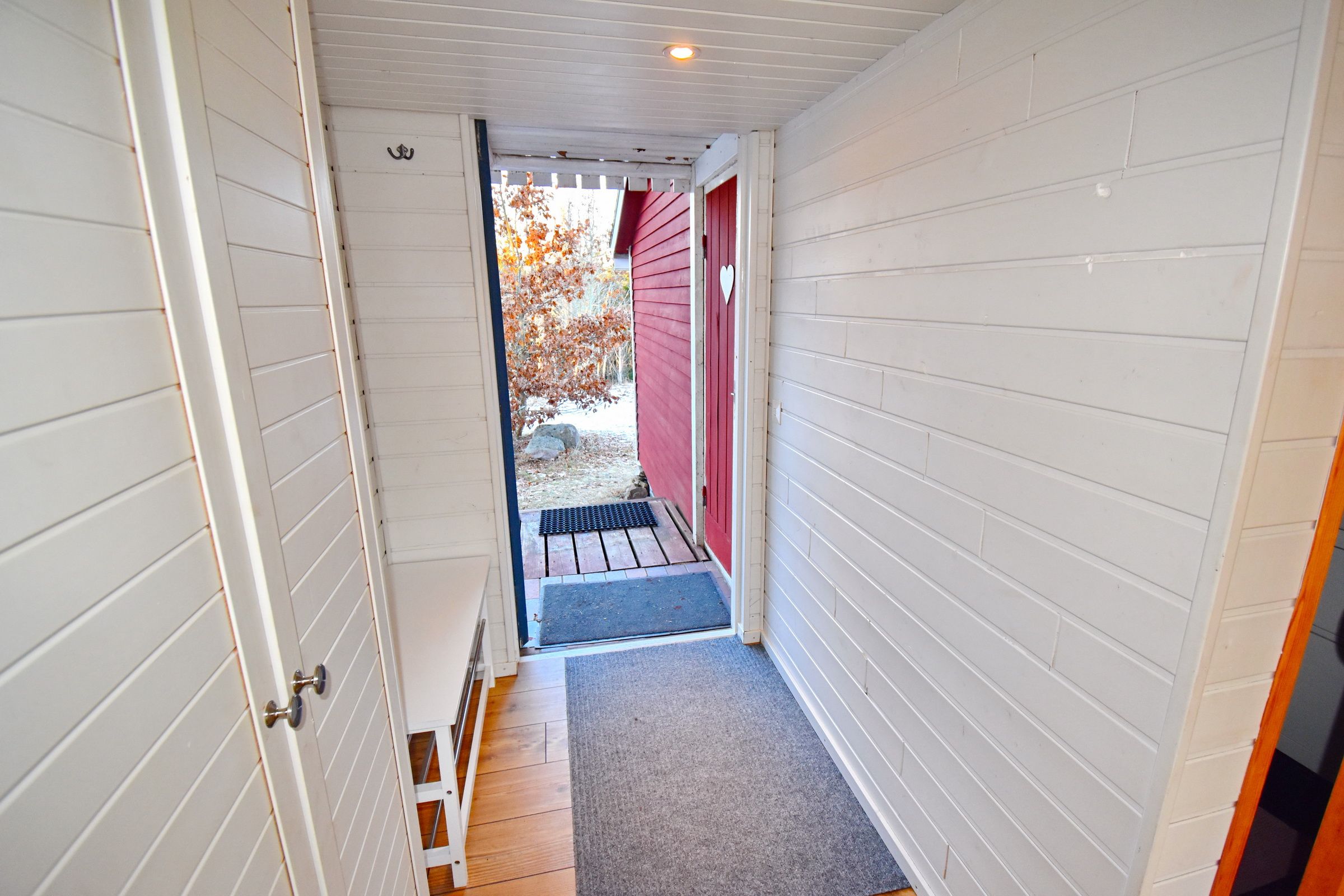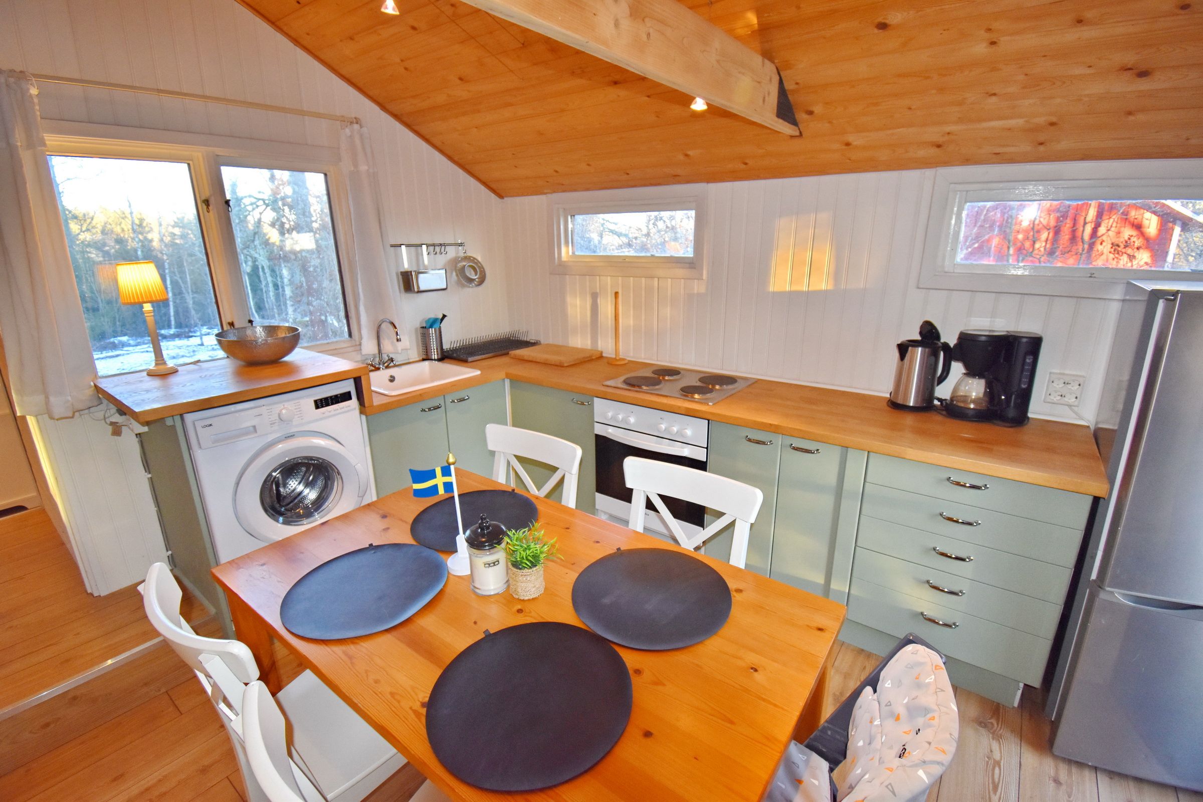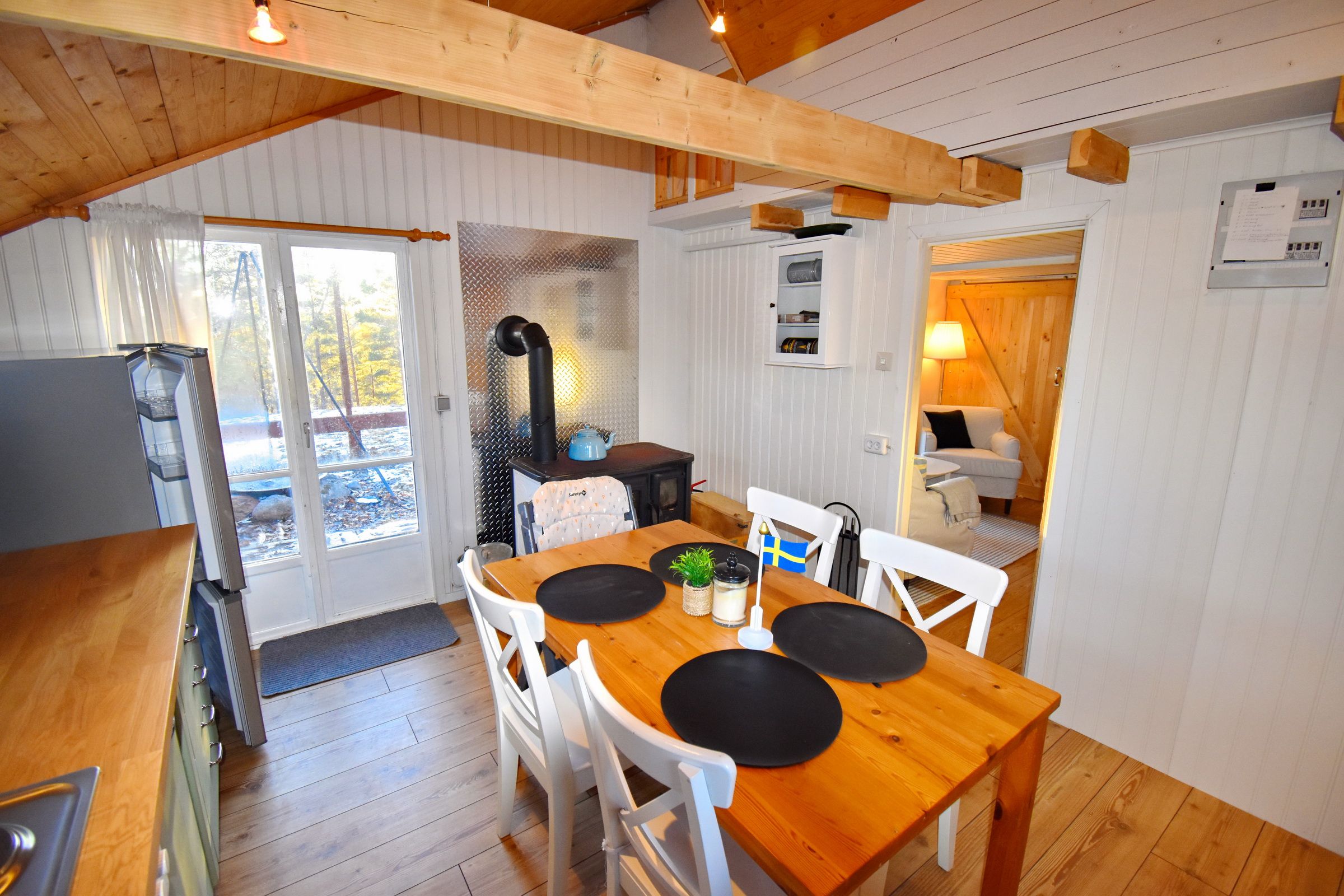 Das Haus (ca. 60 m²) verfügt ein kleines Wohnzimmer und eine schöne Küche mit Holzofen und Essplatz. Von der Küche gelangen Sie auf die Terrasse. Von hier aus können Sie den in der Nähe gelegenen See bereits sehen! Haus Smycke verfügt über insgesamt drei Schlafzimmer, eines mit Doppelbett und eines mit einem Ausziehbett für 2 Personen sowie zusätzlich einem Schlafboden mit Einzelbett. Der Schlafboden ist nur über die Außentreppe auf der Terrasse zugänglich. Im Haus gibt es einen Duschraum mit Dusche und Waschbecken. Das WC ist separat mit überdachtem Zugang von außen, nur zwei Schritte neben der Eingangstür.