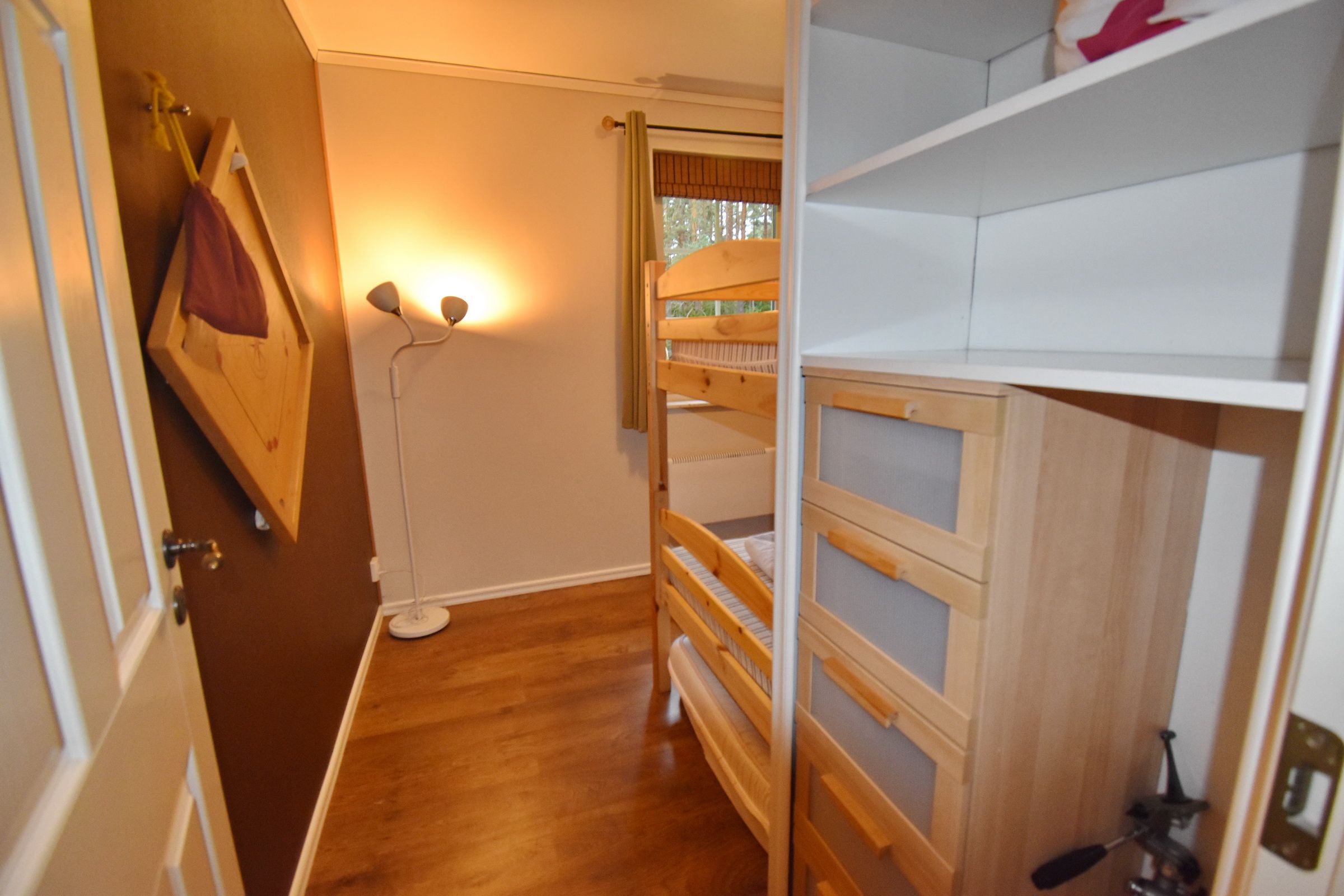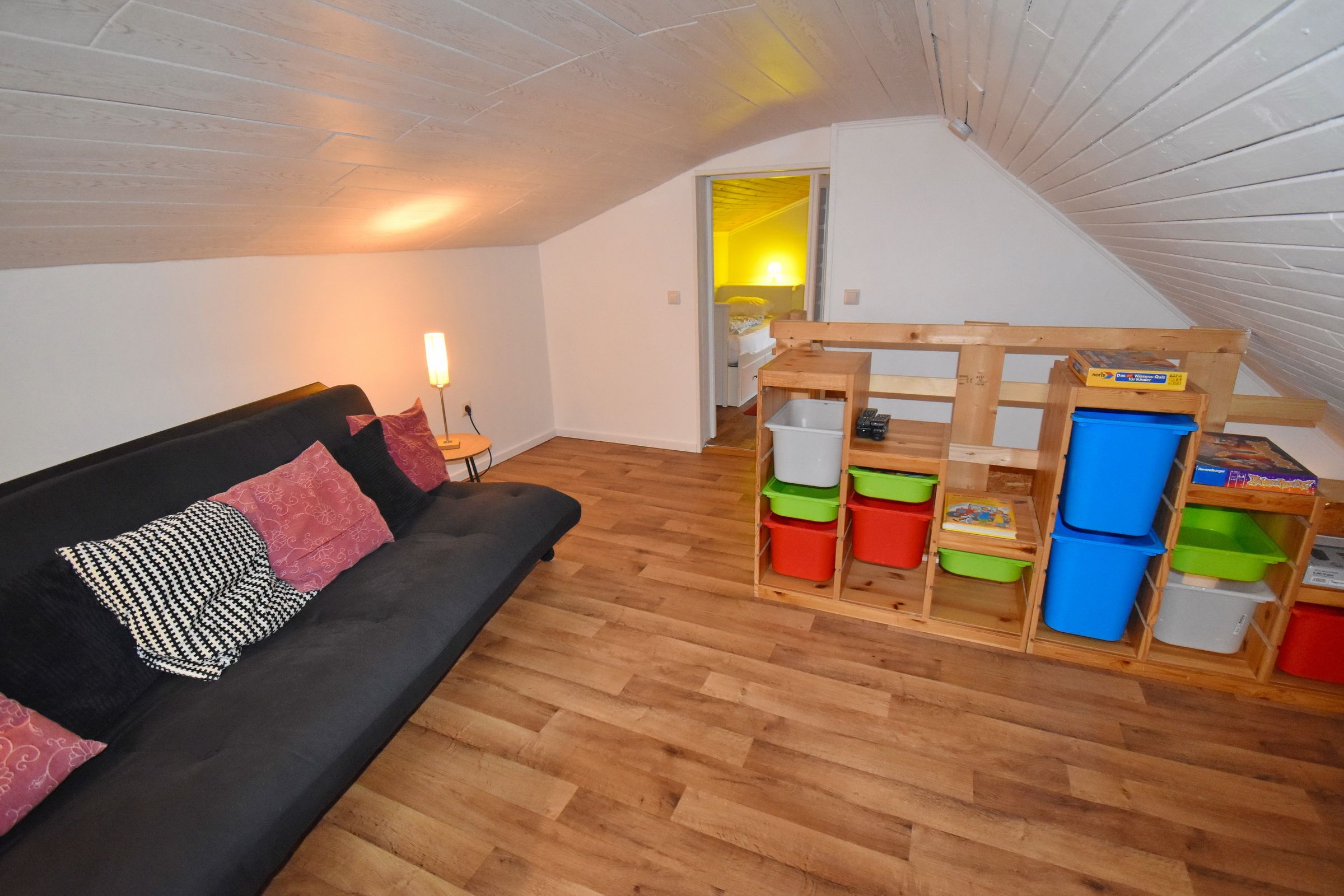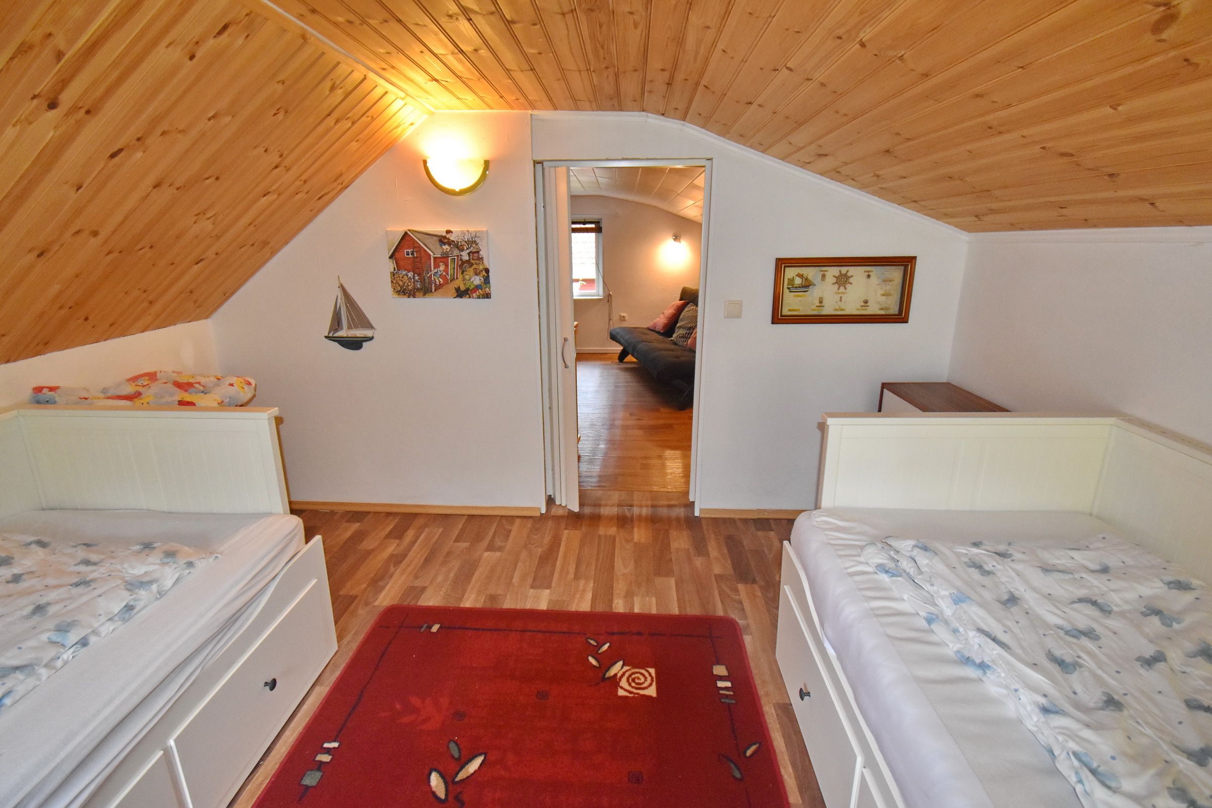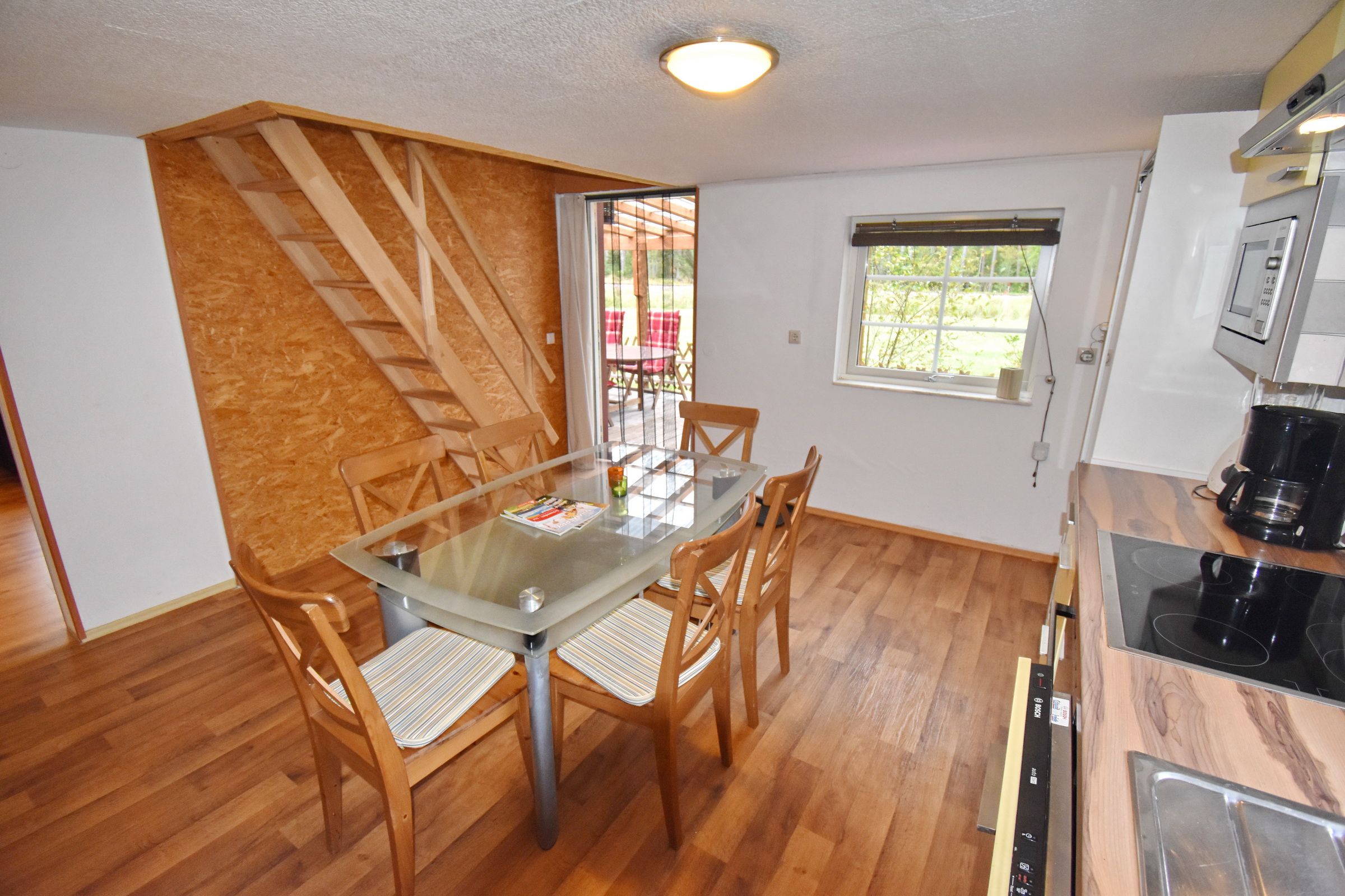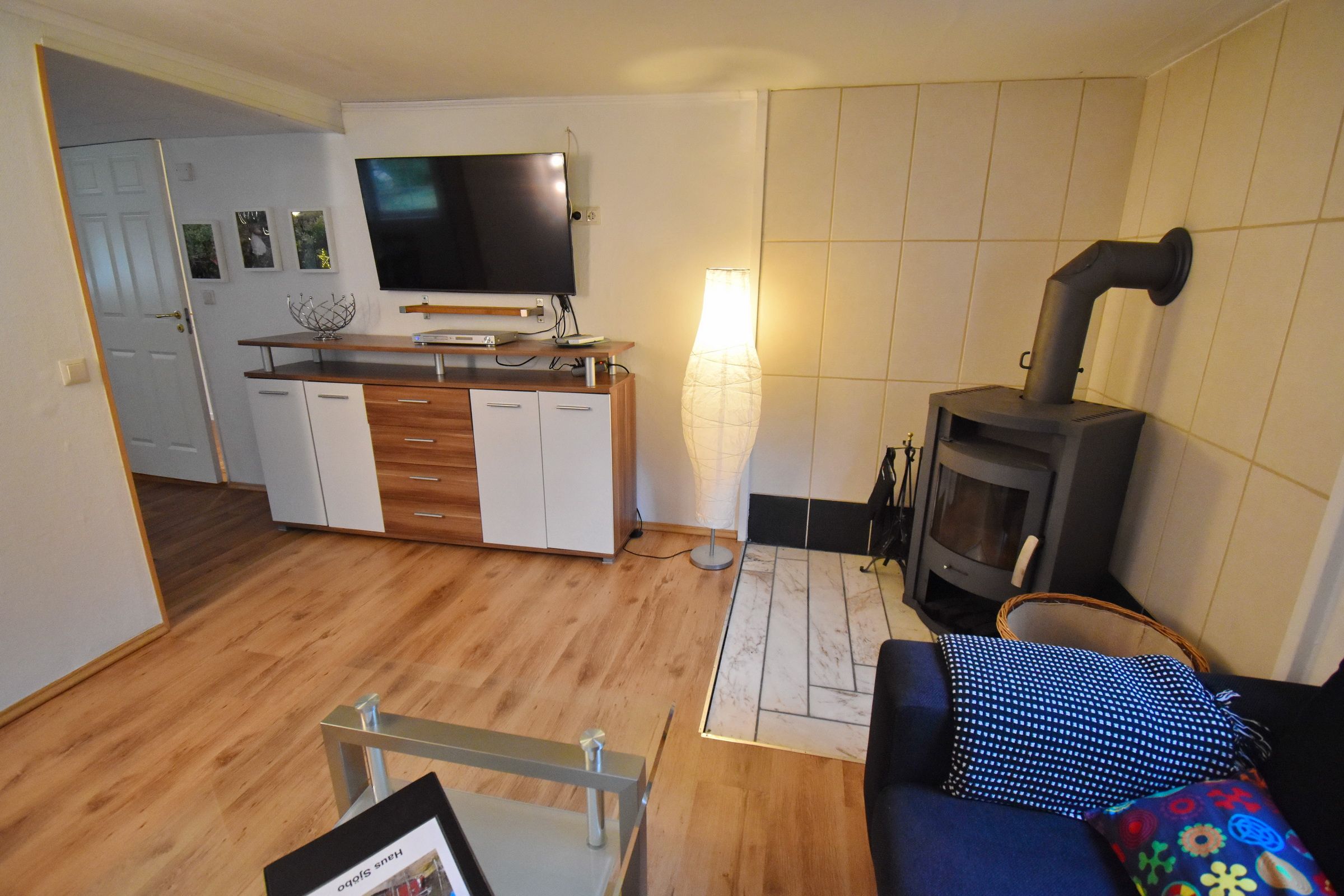 Küche mit E-Herd, Kühl-Gefrierschrank, Geschirrspüler, Waschmaschine und Essplatz / Wohnzimmer mit Kaminofen und deutschem Sat-TV / Bad mit WC und Dusche / Schlafzimmer mit Doppelbett // Obergeschoss: Schlafzimmer mit 2 Einzelbetten / Durchgangszimmer (Falt-Tür zwischen den Zimmern im Obergeschoss)