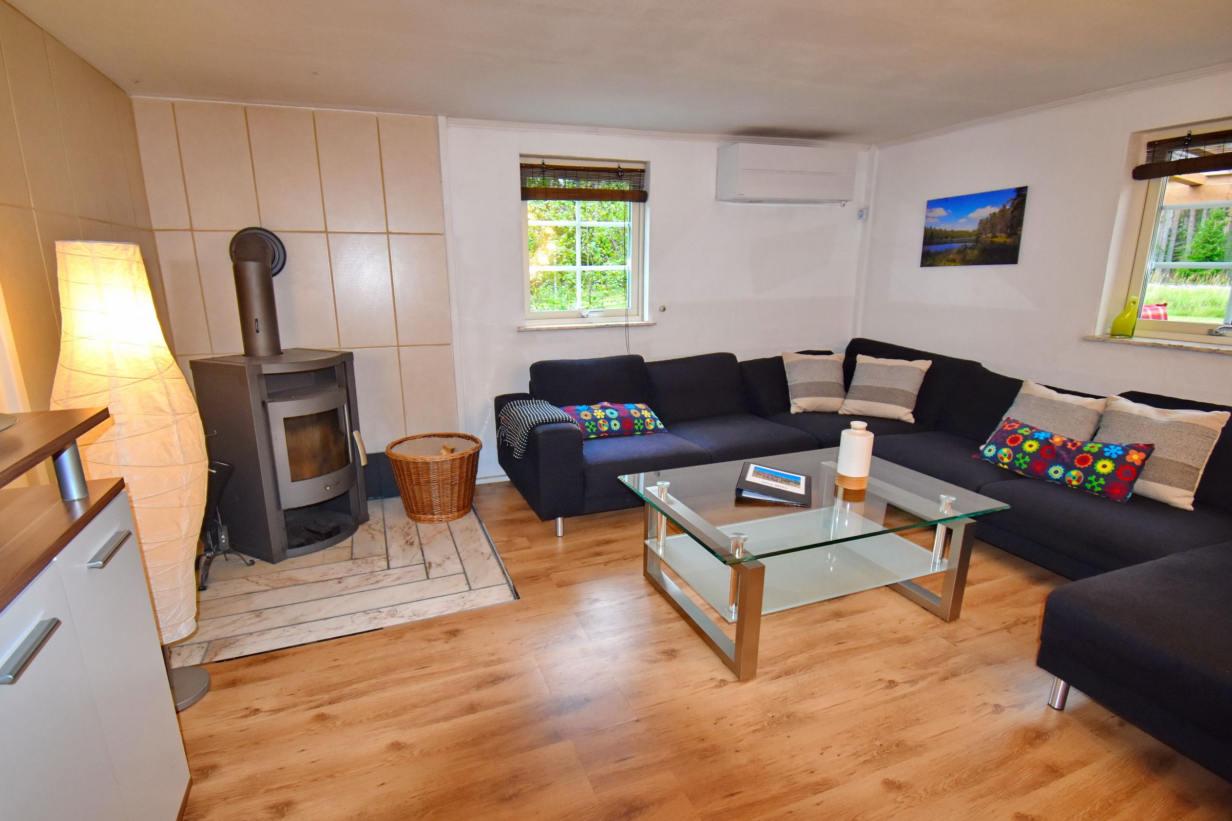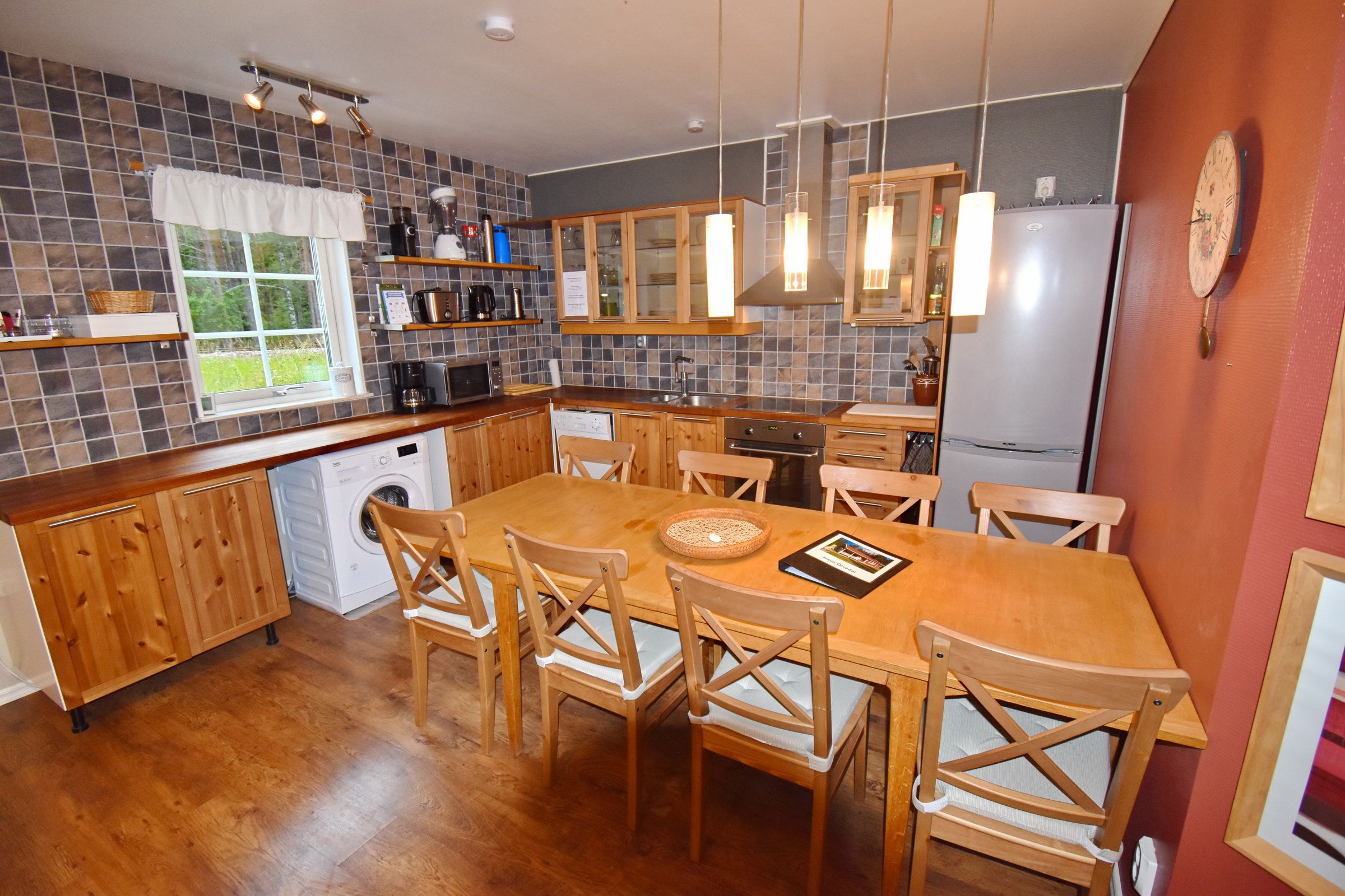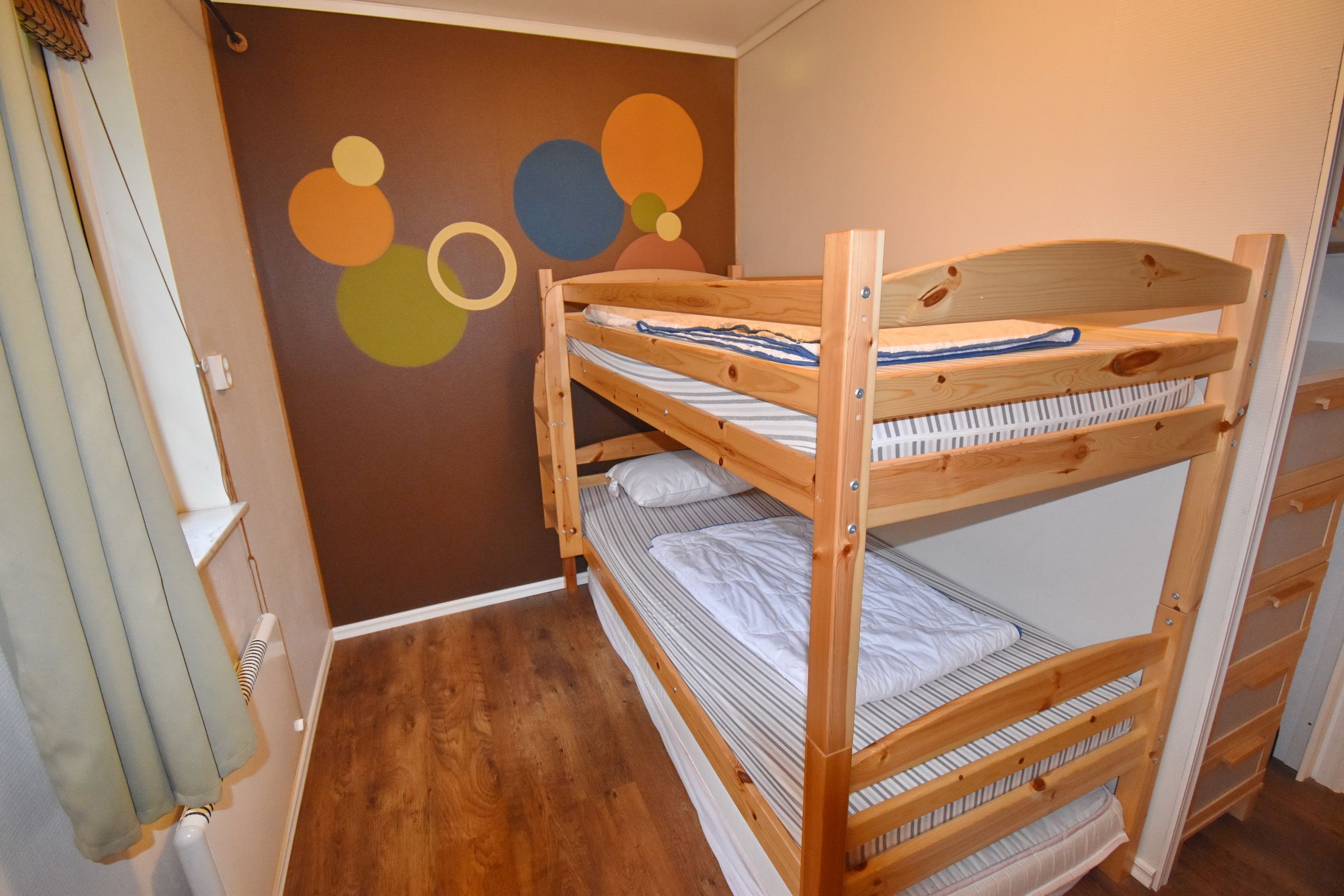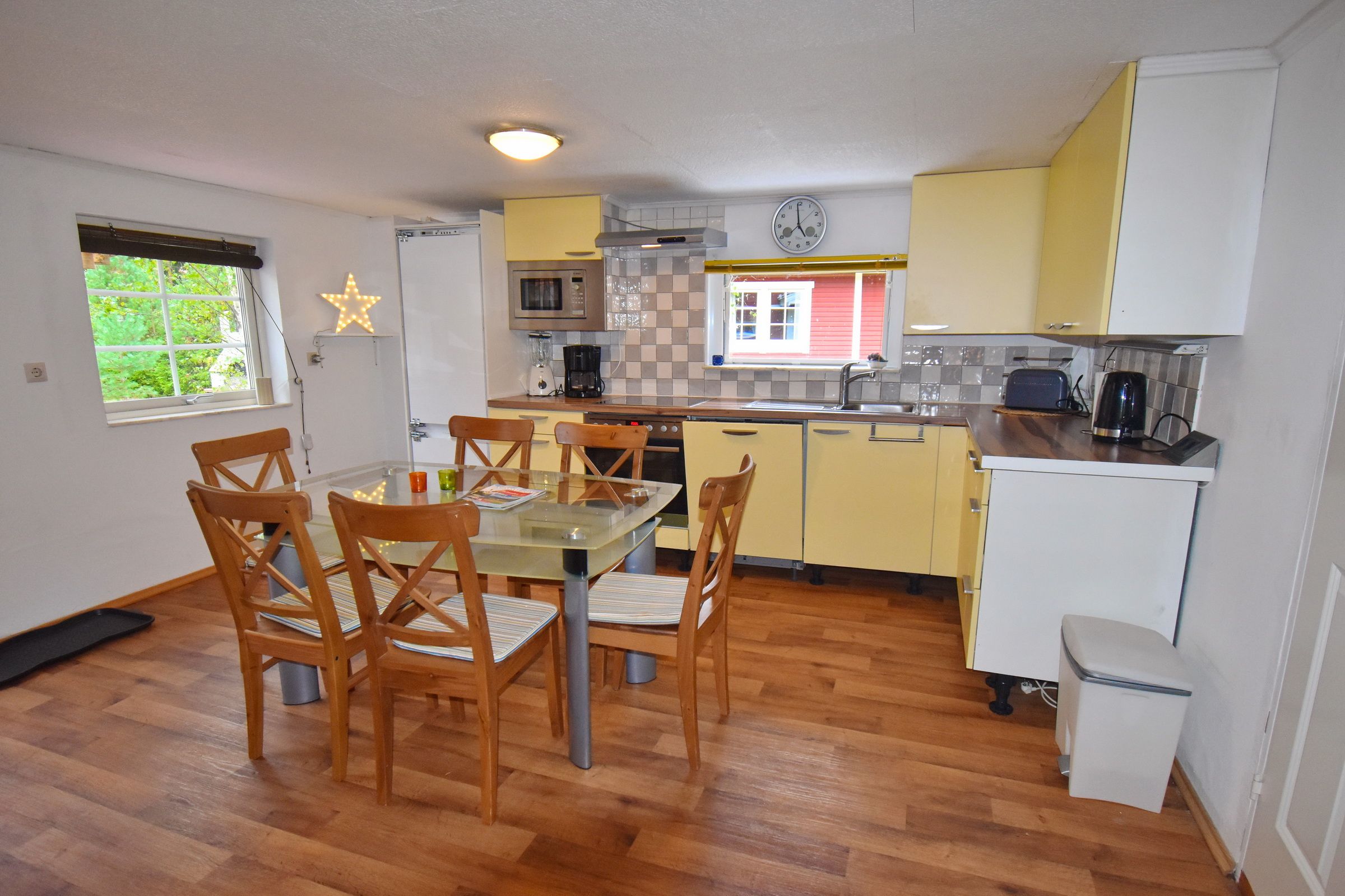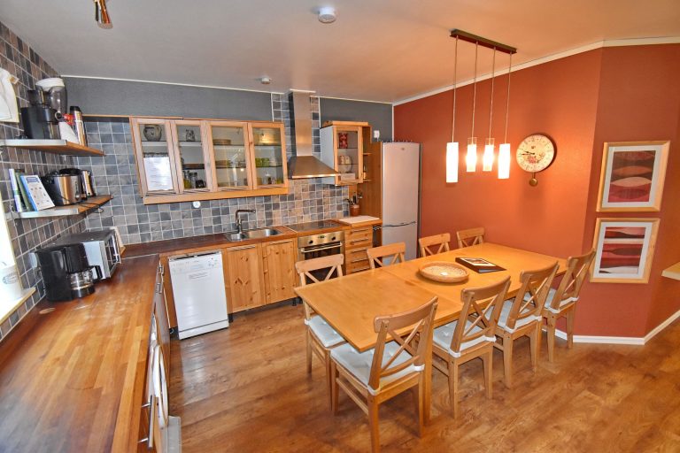 Küche mit E-Herd, Kühl-Gefrierschrank, Geschirrspüler, Waschmaschine und Essplatz / Wohnzimmer mit Schlafcouch, Kaminofen und deutschem Sat-TV / Bad mit WC und Dusche / Schlafzimmer mit Doppelbett / Schlafzimmer mit Etagenbett