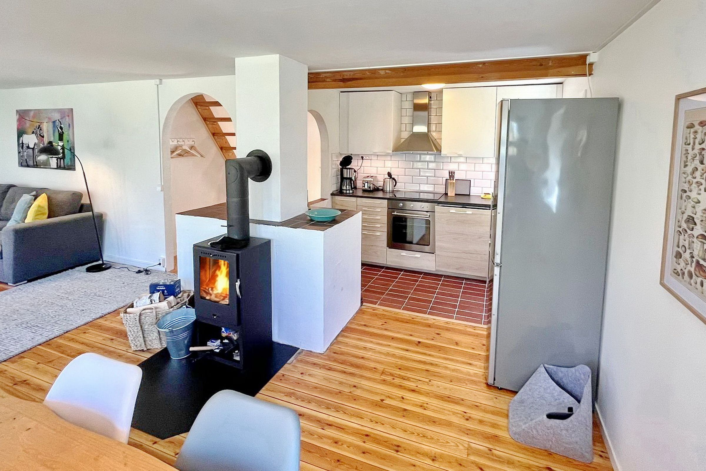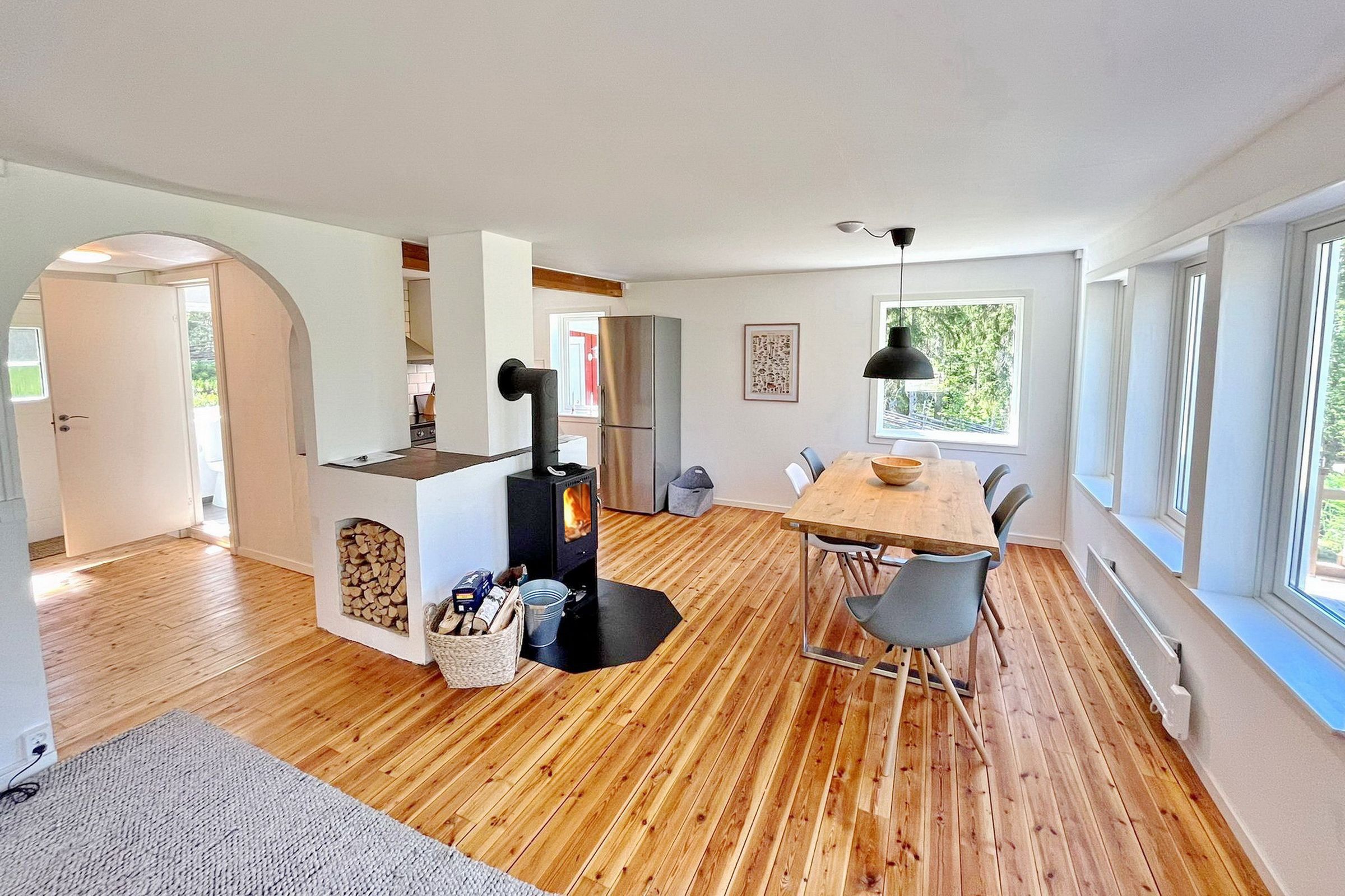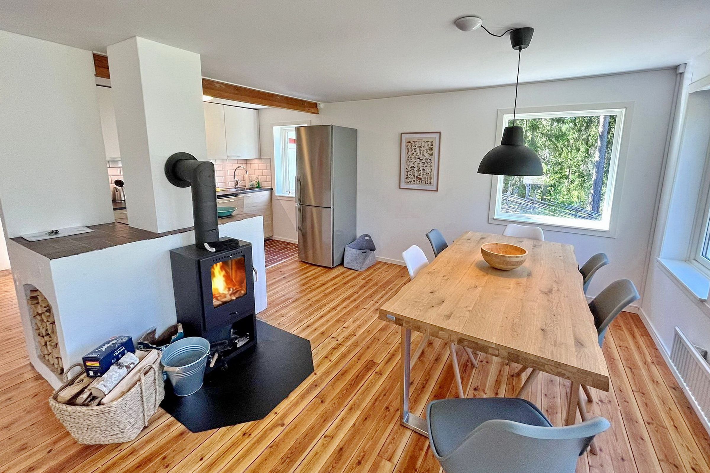 Im Erdgeschoss verfügt das Haus über einen offenen Wohn- und Essbereich mit Kaminofen und Ausgang zur Holzveranda mit Blick zum See. An den Essbereich grenzt die Küche mit E-Herd, Kühl-Gefrierschrank und Geschirrspüler an. Außerdem gibt es im Erdgeschoss ein modernes Badezimmer mit WC und Dusche sowie ein Schlafzimmer mit Doppelbett. Im Obergeschoss finden Sie ein großes Schlafzimmer mit Doppelbett und mit Blick zum See und ein kleineres Schlafzimmer mit Etagenbett. Insgesamt bietet Haus "Sinnerbo" somit 6 Personen Platz. WLAN ist inklusive.