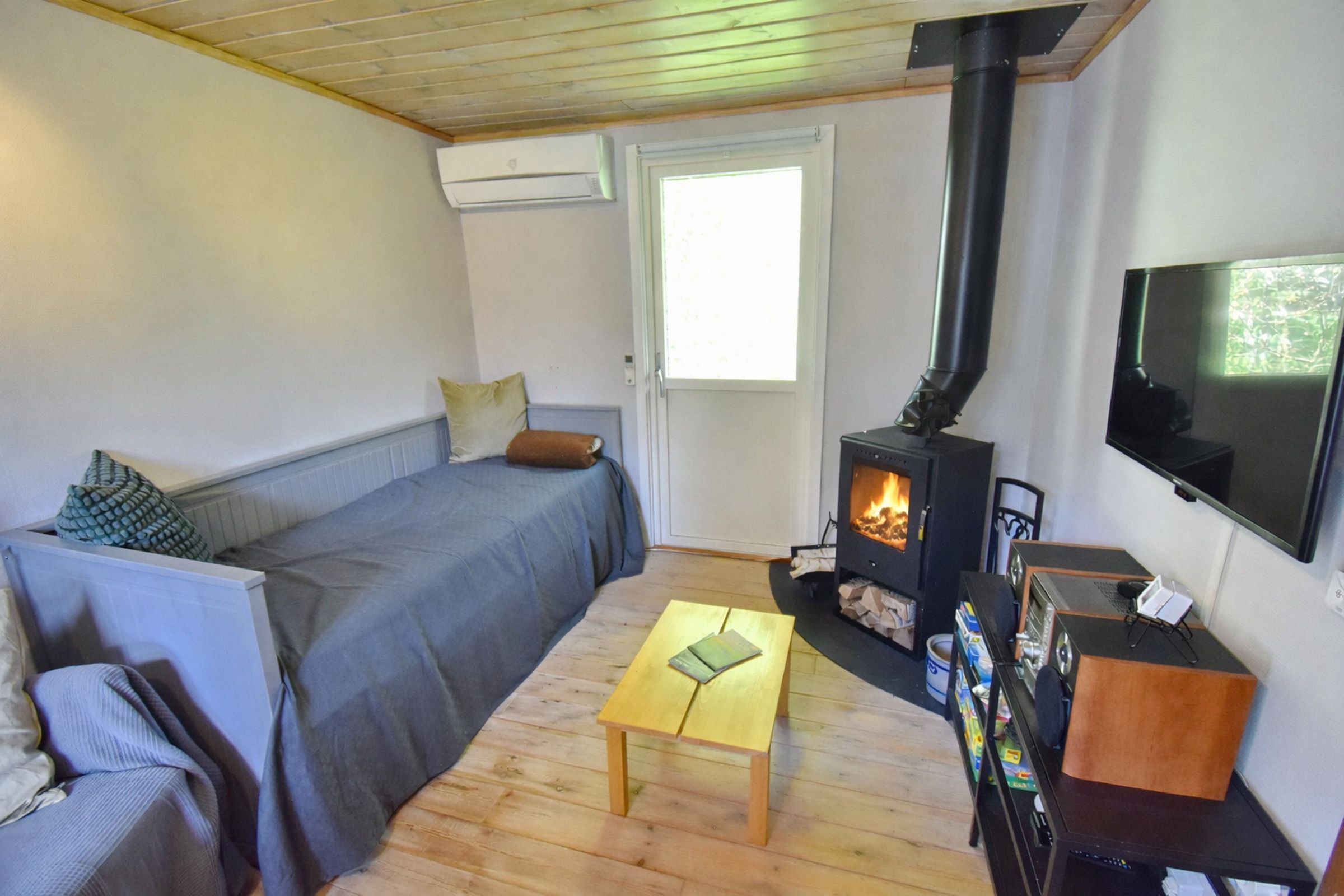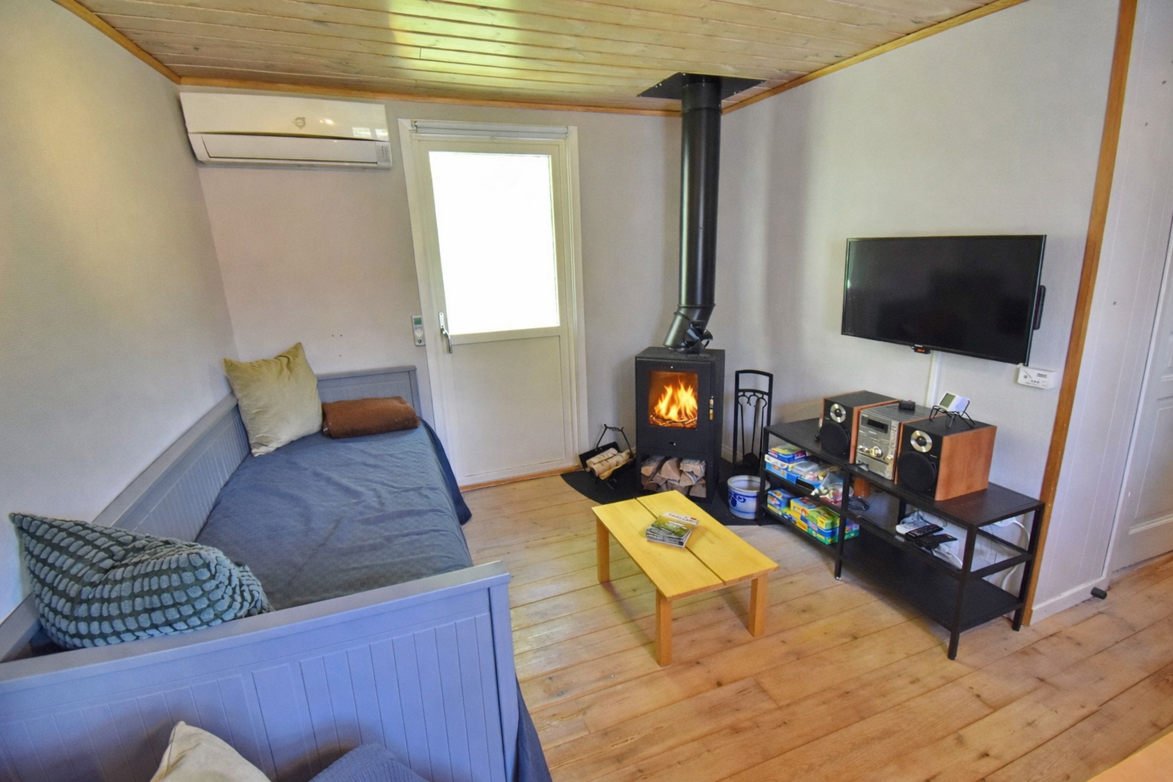 Sie betreten das Haus über die überdachte Eingangsveranda. Das Haus verfügt über ein Wohnzimmer mit Schlafsofa, kleinem Essplatz und Kaminofen sowie deutschem Sat-TV. Die Küche ist ausgestattet mit Kühl-Gefrierschrank, E-Herd und Mikrowelle. Außerdem gibt es ein Schlafzimmer mit Doppelbett und ein Badezimmer mit WC, Waschmaschine und Dusche.