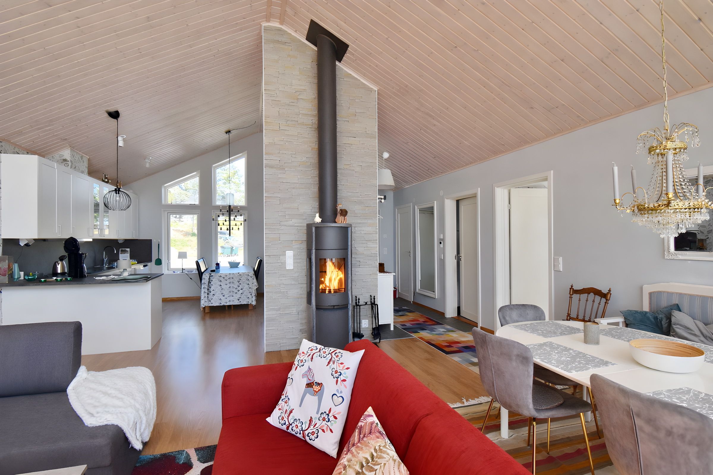 Herzstück des Hauses ist das große offene Wohn- und Esszimmer mit integrierter Küche. Durch die große Glasfront haben Sie eine herrliche Sicht auf das Meer. An kühleren Abenden verbreitet der Kaminofen viel Gemütlichkeit. Die Küche ist an den offenen Wohnraum angeschlossen und gut ausgestattet. Die "Villa Mösund" verfügt über vier Schlafzimmer (2x mit Doppelbett, 2x mit Etagenbett) und zwei Badezimmer mit WC und Dusche (1x zusätzlich mit Badewanne). Das Haus ist also auch sehr gut für gemeinsam reisende Familien geeignet! Außerdem gibt es einen Waschraum mit Waschmaschine und Trockner. Für ein Kleinkind stehen ein Kinderbett und ein Hochstuhl, sowie eine Wickelauflage und ein Töpfchen zur Verfügung.