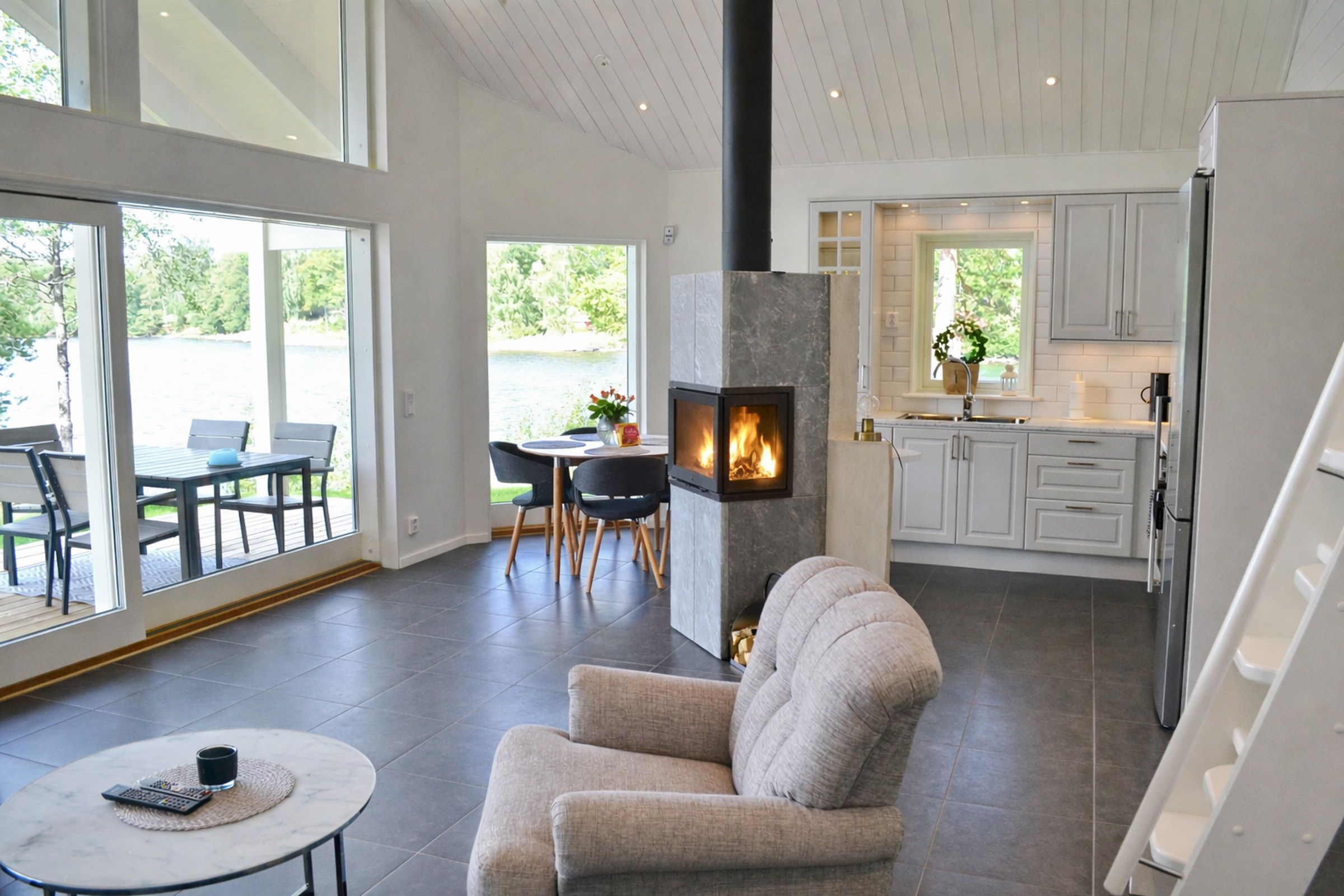 Das Interieur begeistert mit einer modernen, hochwertigen Ausstattung im modernen, skandinavischen Stil. Herzstück des Hauses ist das offene Wohnzimmer mit traumhaftem Seeblick. Eine große Schiebetür öffnet den Wohnraum zu der davorliegenden überdachten Veranda. An kühlen Abenden sorgt der Kamin in der Mitte des Raumes für wohlige Wärme. Die gut ausgestattete Küche ist in den Wohnraum integriert. Im Wohnbereich gibt es deutsches Sat-TV, sowie im ganzen Haus W-LAN-Empfang.